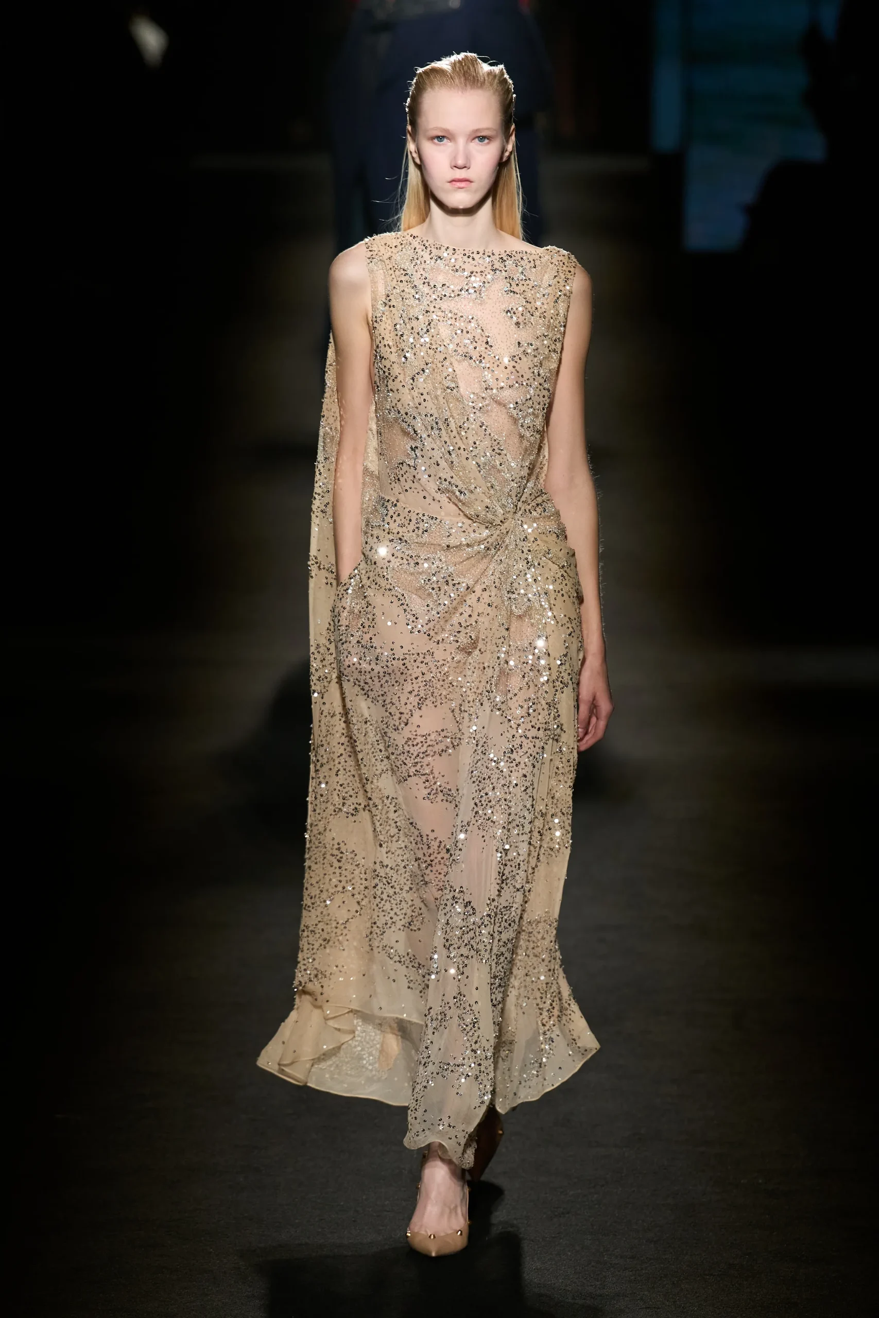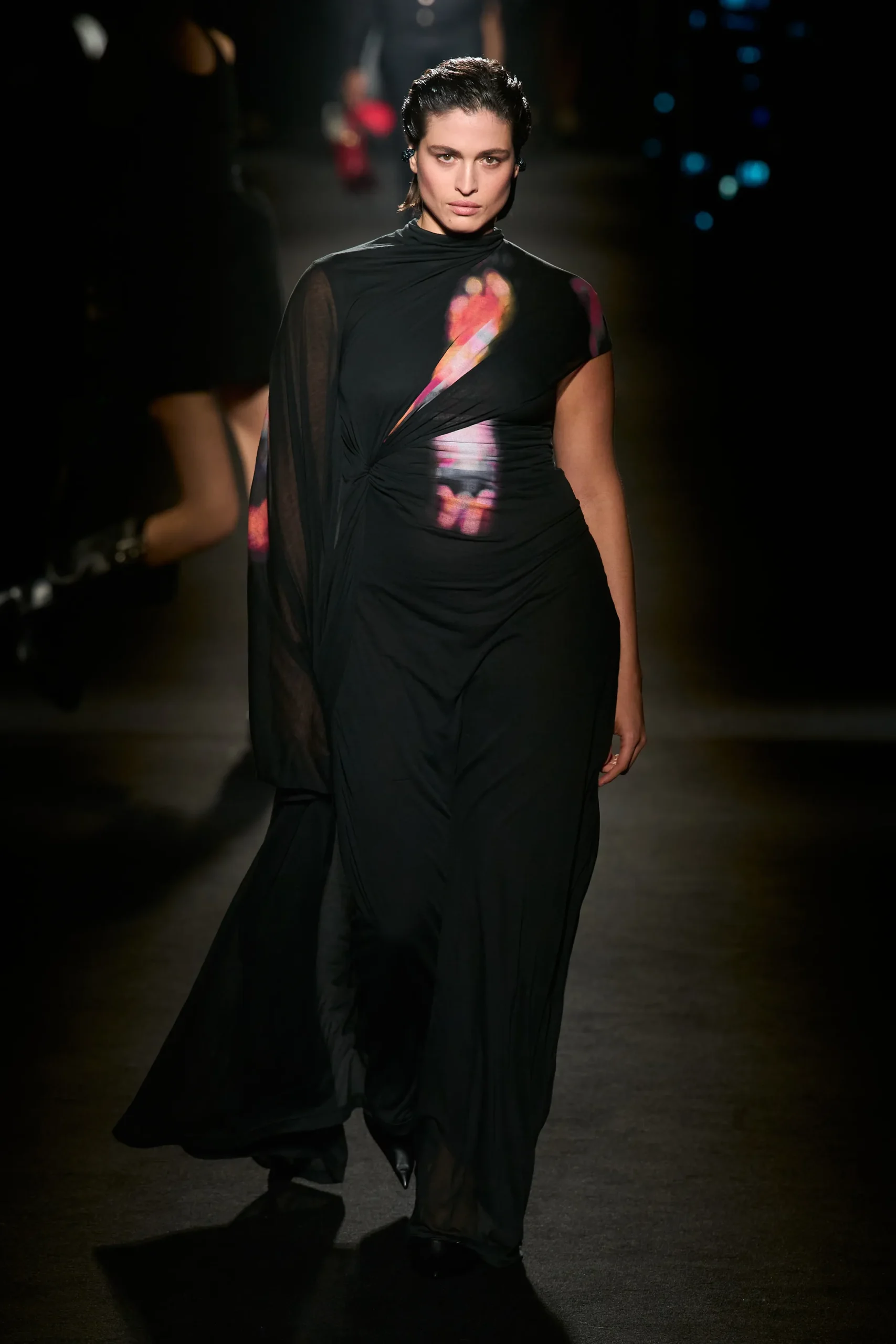Con un elenco de modelos que representan diversas procedencias y edades, tal grandeza era un retrato juvenil que contrastaba  con los numerosos vestidos de drapeados en jersey de seda o terciopelo, con escotes y cut outs que revelaban piel de una manera poderosa. El movimiento natural del cuerpo en aquellas siluetas oscilaba control y fluidez, reluciendo en sus versiones con lentejuelas. “Metafóricamente, la oscuridad y la luz se exploran como elementos definitorios de la condición humana, creando retratos de personas evocados a través de la tela”.