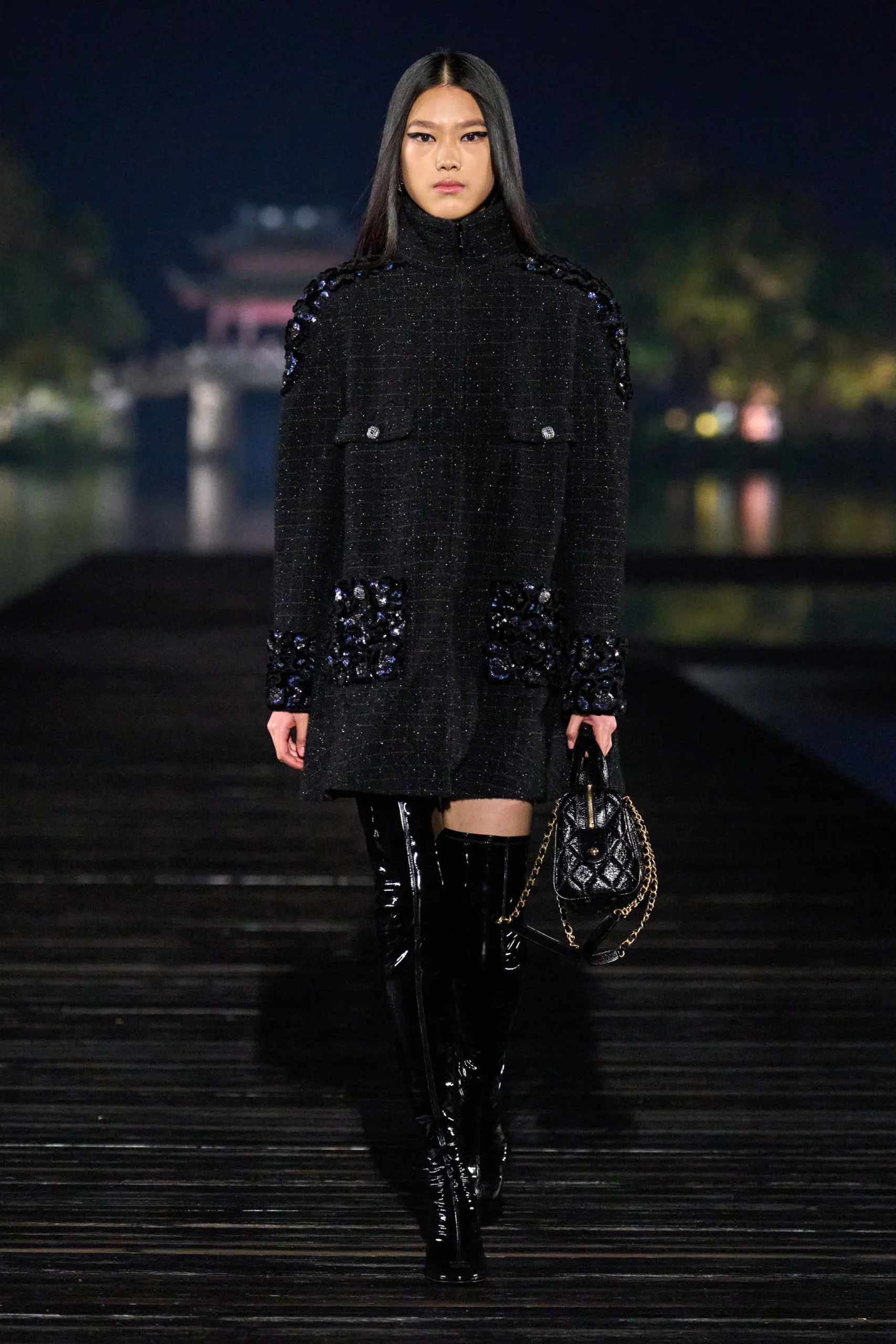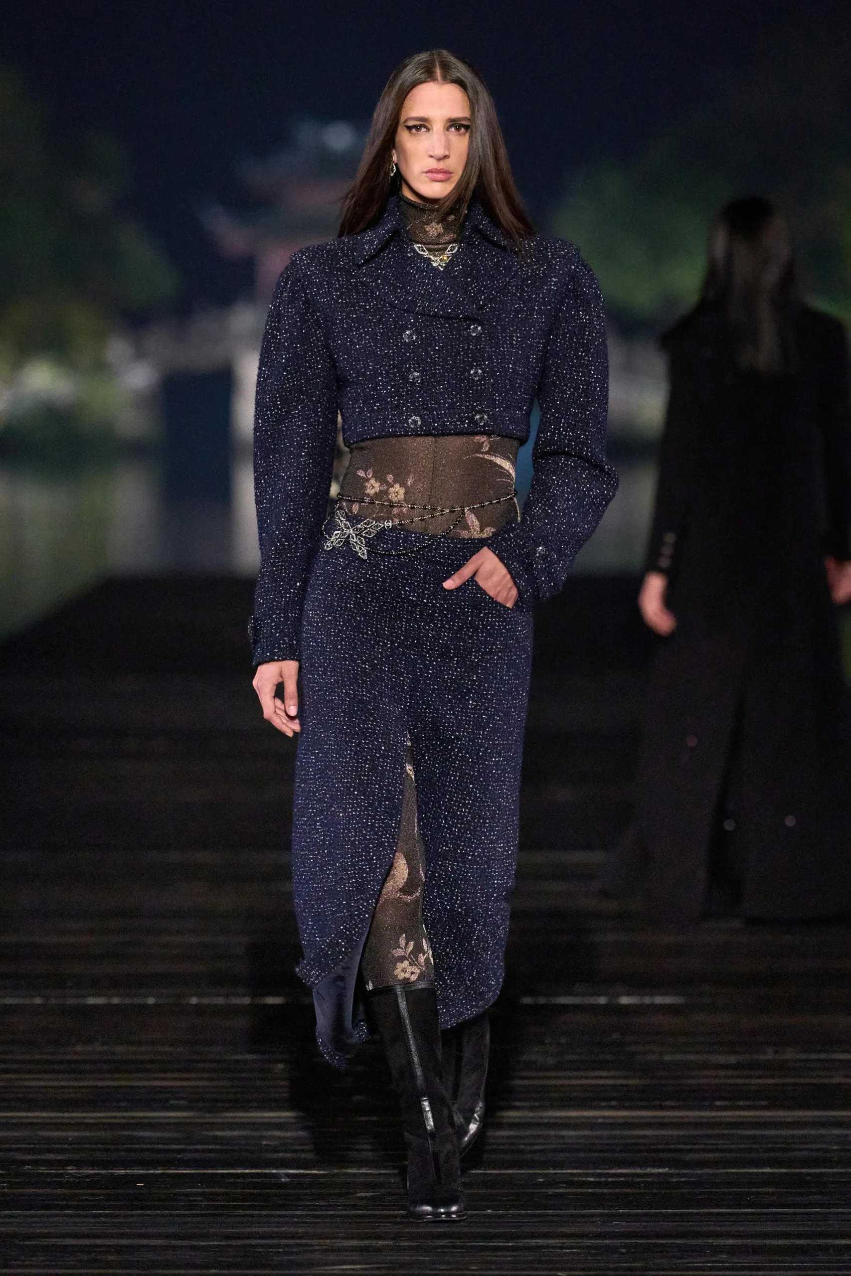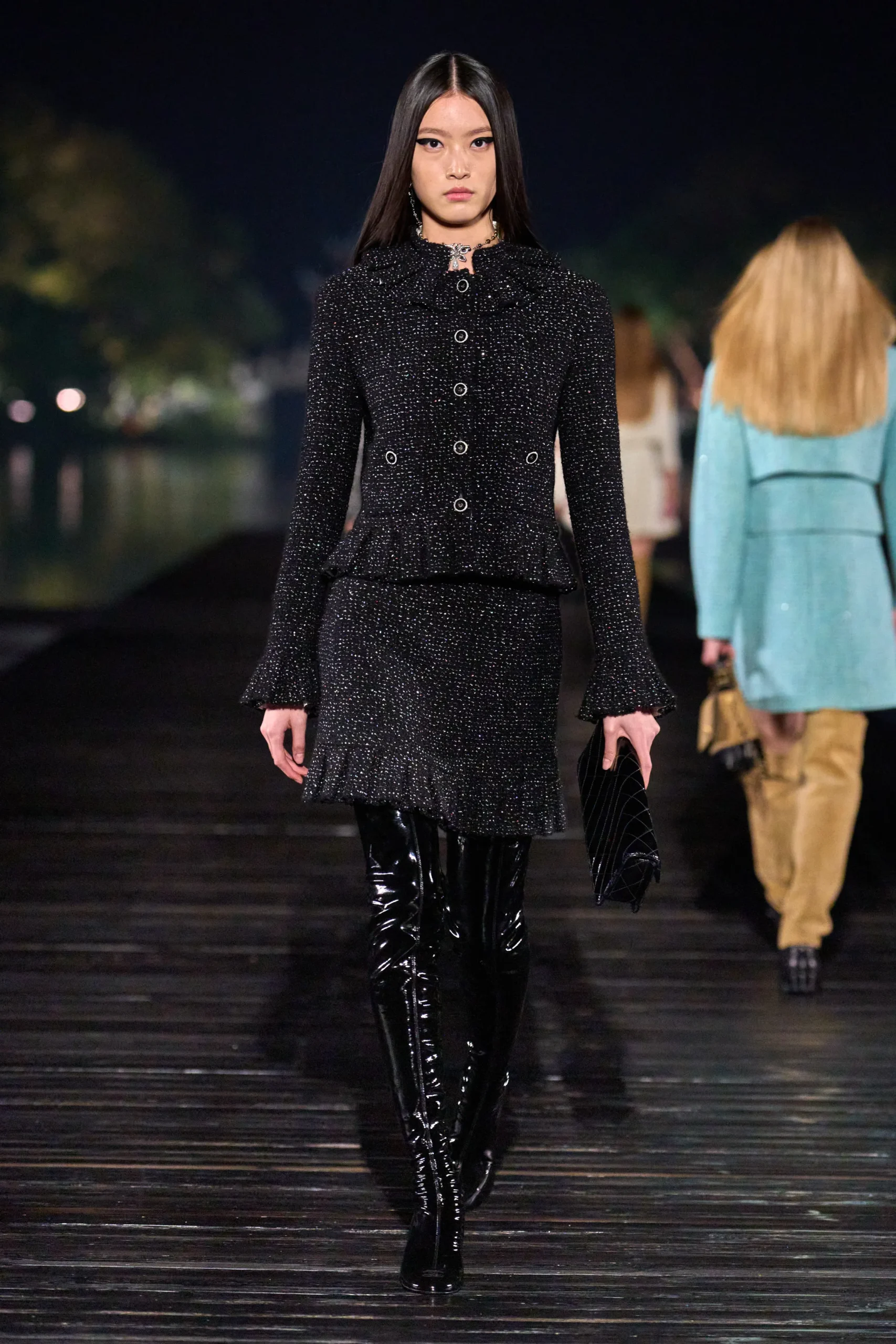 Regresando al fogoso y apacible escaparate que iluminaba el paisaje natural del lago, un radiante espejismo brillaba por la maravilla del tweed. Criaturas salían del agua llevando largos abrigos bouclé negros, adornados tenuemente con una majestuosa pedrería que destellaba el camino. El atemporal y clásico suit era reinterpretado a un medida ligeramente corta y deslizándose hasta suelo con una transpirable silueta, precisando un cálido volumen con su aspecto acolchonado y ondeante.