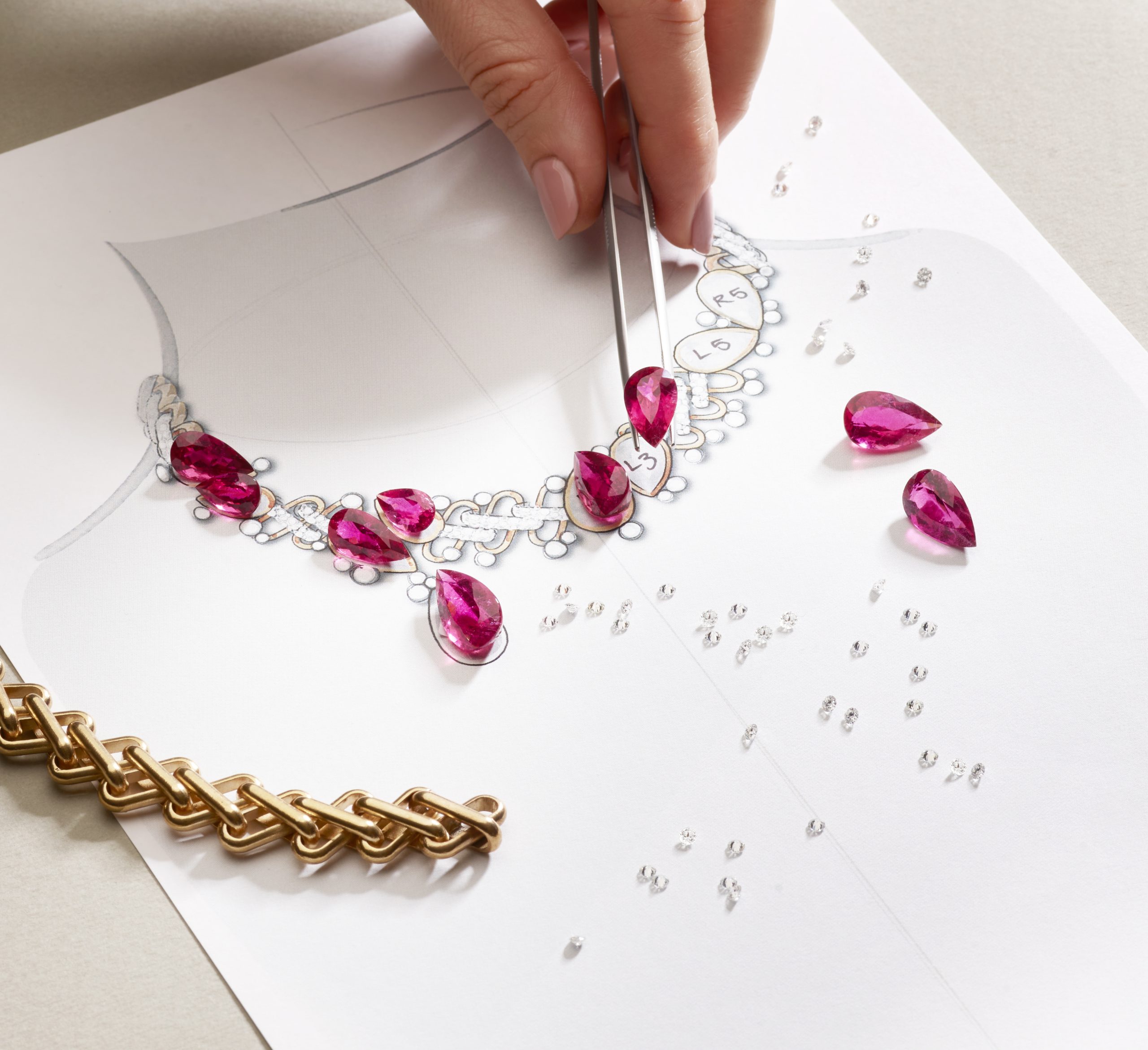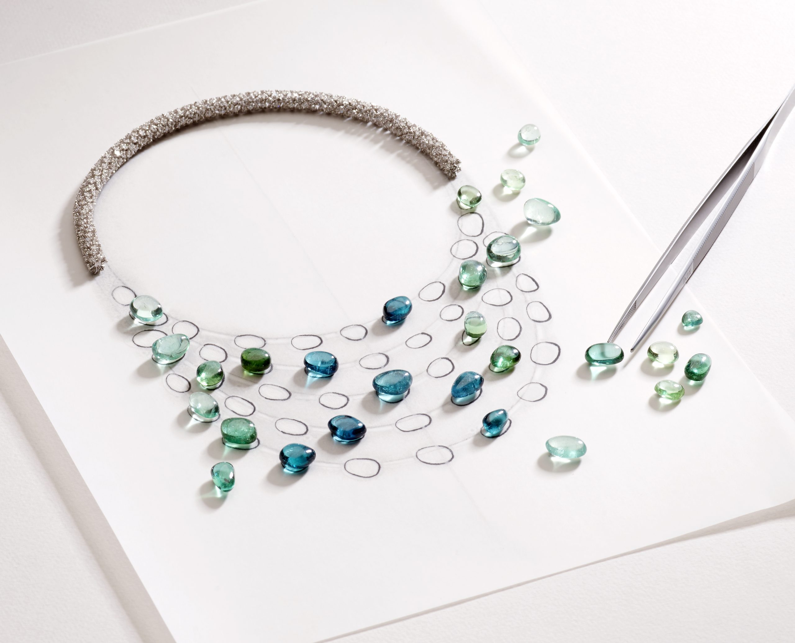 La belleza orgánica de este collar vislumbra una espectacular variedad de turmalinas verdes e intensas rubelitas impregnadas en un ramillete de 47,31 quilates, un anillo con 14,80 quilates de gemas en forma de gotas y unos pendientes de corte pera de 27,94 quilates.