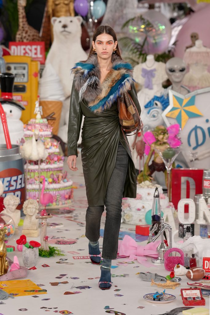 Desde que se unió a la marca en 2020, Martens ha transformado sus desfiles en verdaderos espectáculos: transmisiones en Zoom, búsquedas de huevos de oro por los barrios de Milán y colinas hechas de denim. El entusiasmo que sobrecoge a Diesel es impresionante. La obsesión colectiva que se tiene por la actitud irreverente, pero consciente de sus diseños, ha provocado que la Gen Z ponga su mirada en una colección inspirada en los paseos de la vergüenza: aquellos momentos en los que uno sale felizmente tumbado de algún lugar en pleno amanecer.