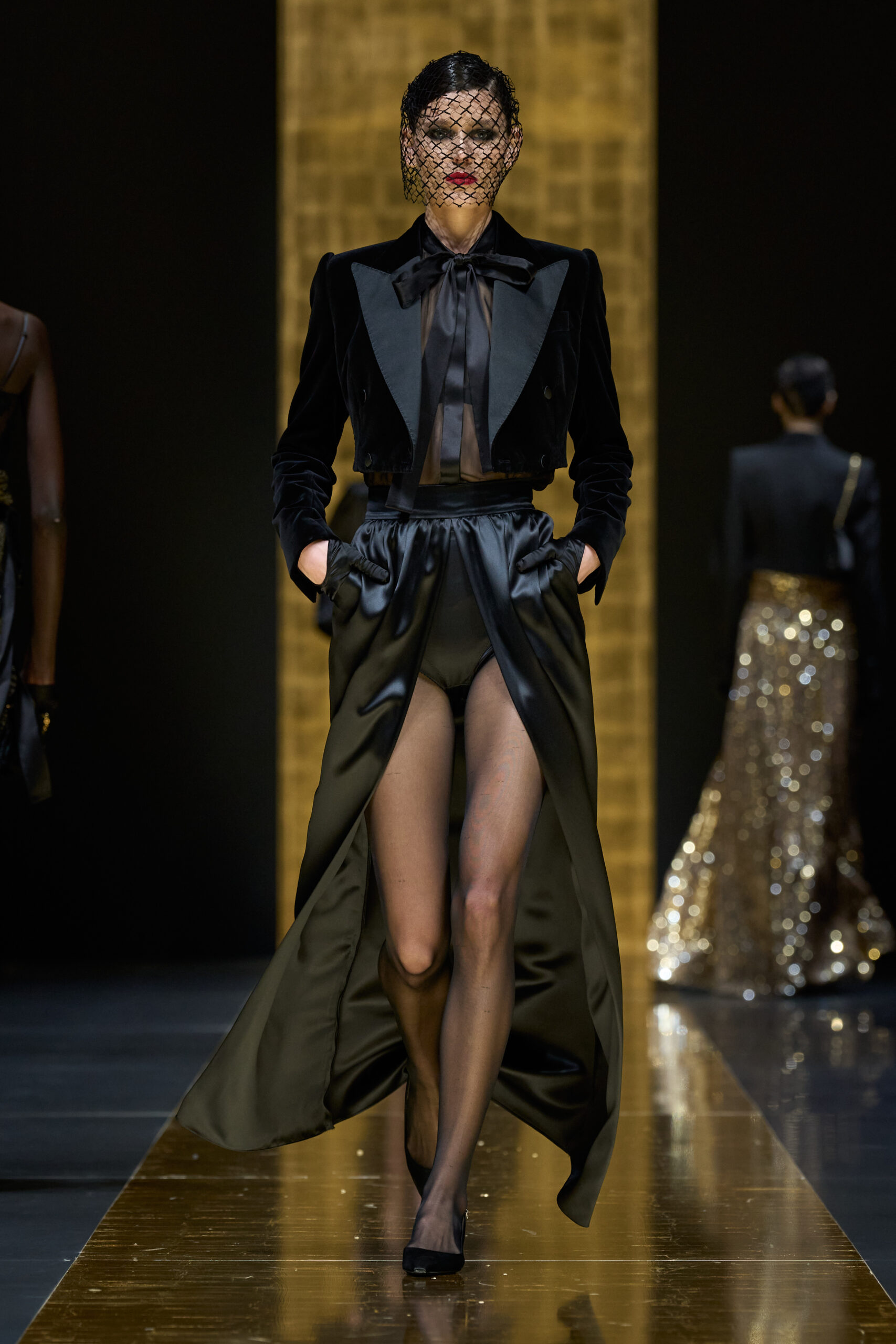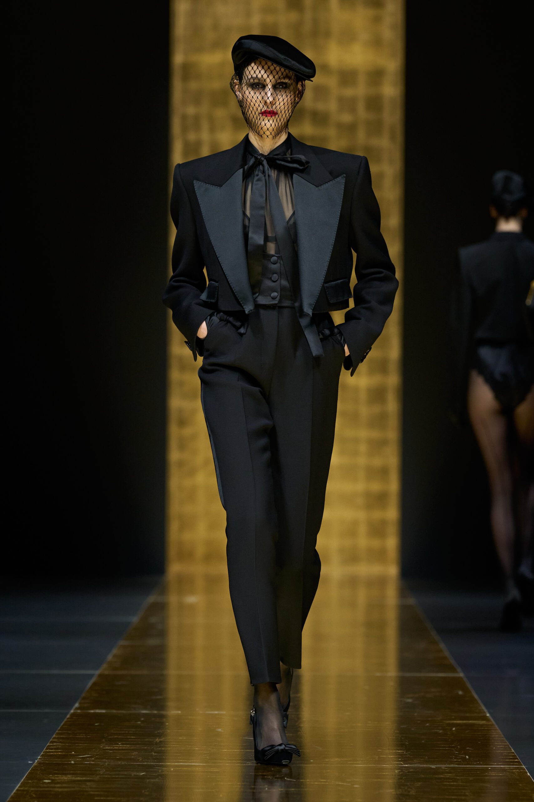 Se podría decir, que reinterpretaron el tuxedo, de todas las maneras y combinaciones posibles. Desde una spencer jacket con inmensas y puntiagudas solapas, y por debajo un lace bra; continuando con varios tamaños y extensiones de double – breasted jackets con una silueta hourglass combinadas con velvet trunks o short con fajínes, incluso, se extendieron hacia cuadrados y oversize coats – proclamando una seductora variedad textil. Asimismo, se convierten en piezas que envuelven una austeridad y seducción, que se entrelazan con la longevidad de ambos diseñadores, que propiamente, se enorgullecen de aquel estilo sartorial que conecta con las necesidades de sus clientas en su remodificado ADN.