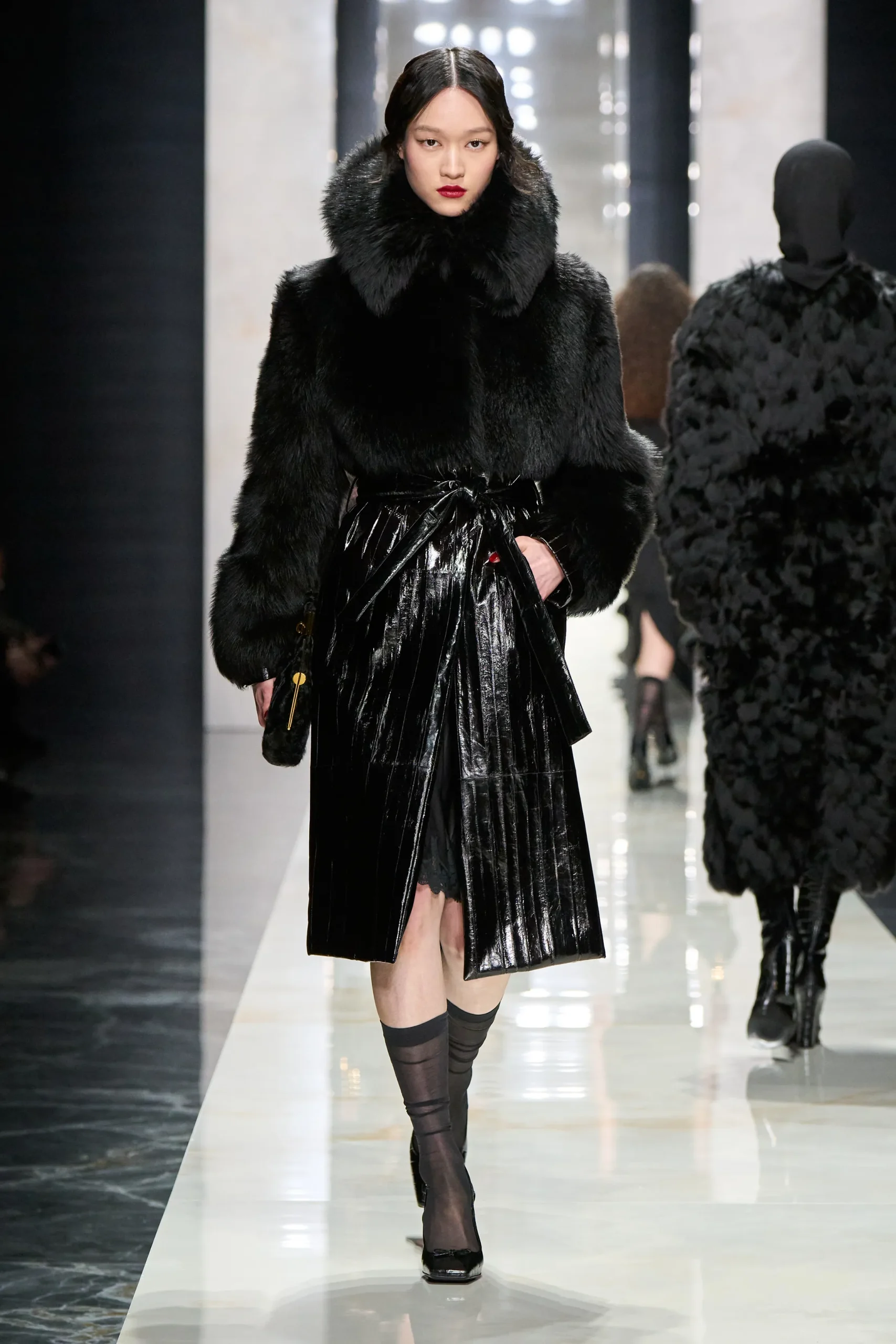Ese sentido de pertenencia se intensificó con un instinto sexual latente y una confección pragmática inherente a la casa. Aunque la mayoría de los looks fueron negros, resultaba admirable la destreza y espontaneidad con la que destellaba esa austeridad siciliana. El preludio fue dramático: abrigos y gabardinas cruzadas con silueta de reloj de arena, solapas puntiagudas que reinventaban el cuello hasta convertirlo en escote, todo con una teatralidad controlada.