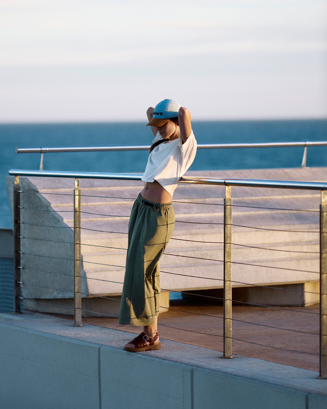 Adentrándose a su línea de prendas, Timberland demuestra la constante innovación por ofrecer un guardarropa que refleje una orgánica modernidad. Su Undyed Denim Chore Jacket – está hecha de una mezcla de diversas telas: 32% Tencel Lyocell con Refibra Technology, una fibra hecha de un 70% de pulpa de madera. La utilidad va de la mano con la implantación de múltiples bolsillos y dobladillo ajustables, destacando en la Utility Summer Skirt y el Brookline Utility Cargo Short – garantizando una sostenibilidad a todo terreno.