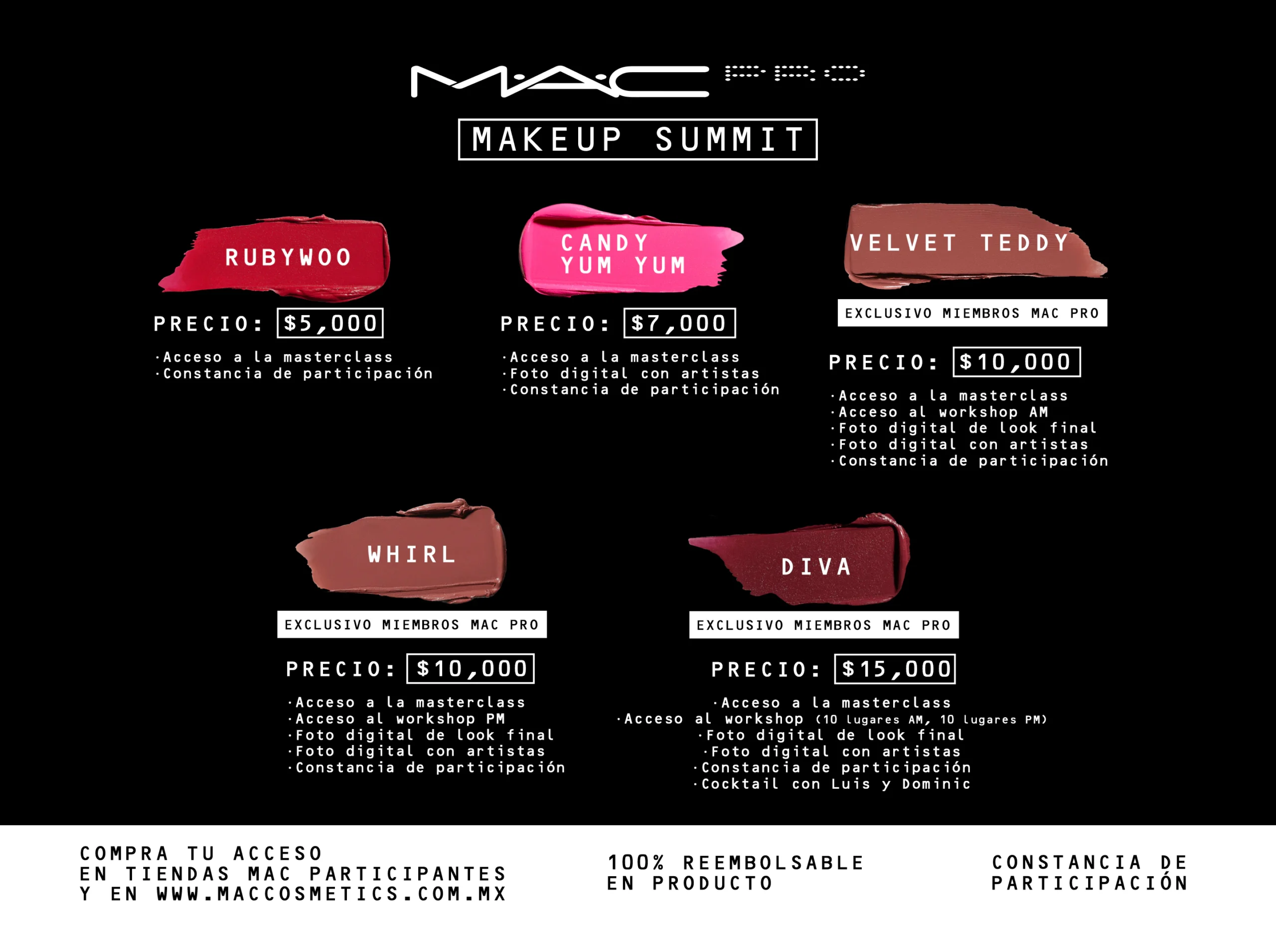 4. Paquete Whirl (Exclusivo para miembros MAC Pro), acceso a la master class, acceso al workshop PM, foto digital del look final, foto digital con artista y constancia de participación, con costo de $10,000