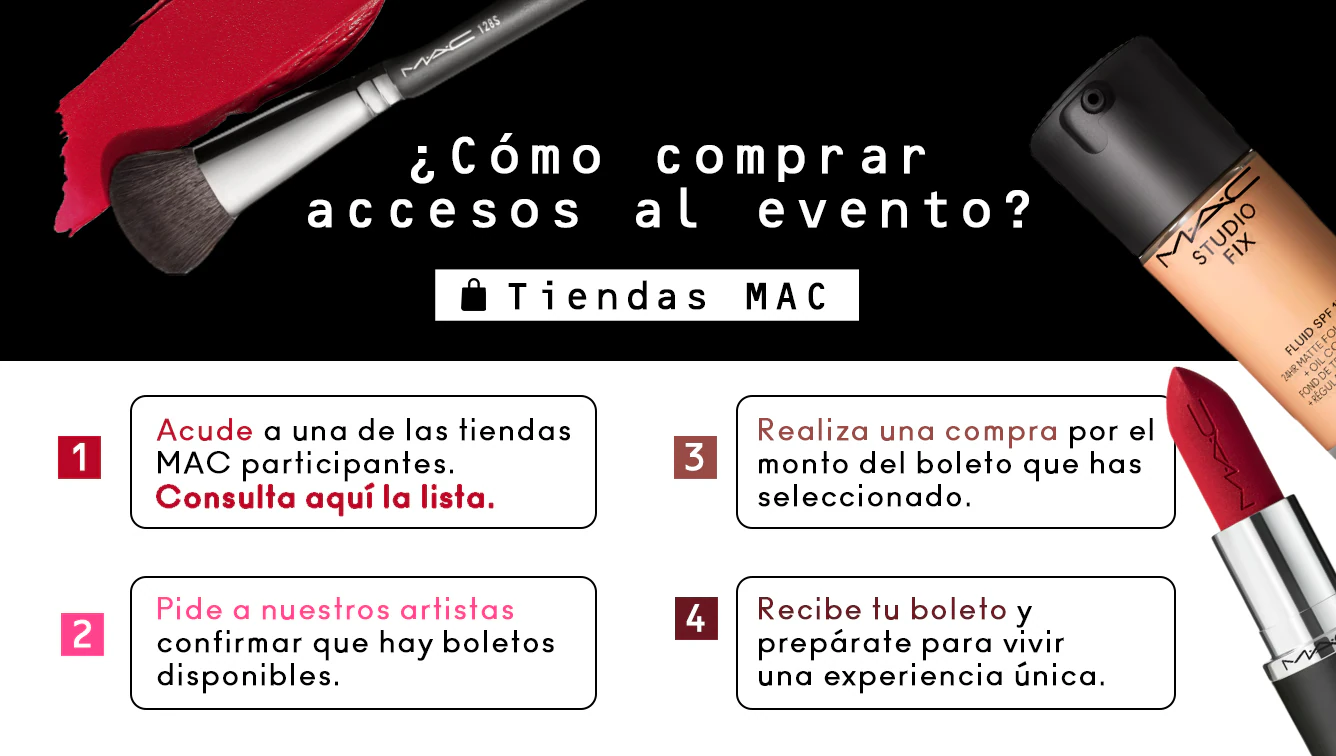 La master class se llevará a cabo próximamente. Te recomendamos estar atenta a la página oficial de MAC Cosmetics y en sus sucursales para poder adquirir tus accesos, te contamos la información de los paquetes disponibles para asistir a esta master class, adaptándose a diferentes necesidades y presupuestos: