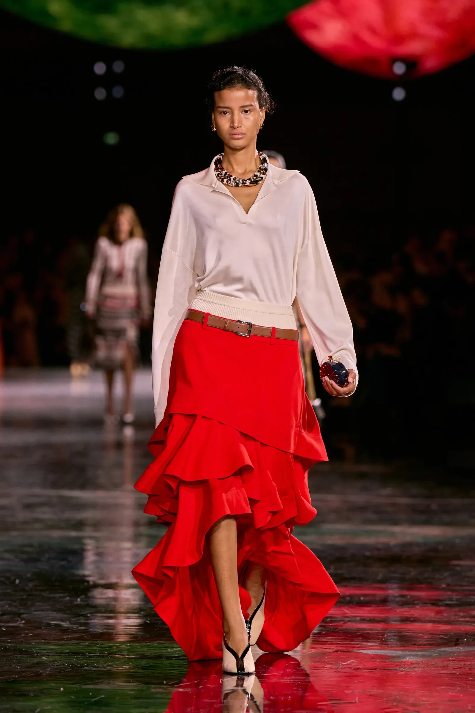 Este icono vintage sigue dominando las pasarelas: Chemena Kamali, en Chloé, ha transformado el renacimiento boho en un statement que enaltece la sensualidad y la libertad con delicadas faldas maxi de tiro bajo con volantes en las caderas. Anthony Vaccarello, en Saint Laurent, impulsa el uso de estampados paisley y transparencias, complementados con chaquetas desgastadas de gamuza y collares repletos de talismanes y jade. Un contraste que armoniza con precisión en sus trajes oficineros y vestidos lenceros de gitana de su colección resort.