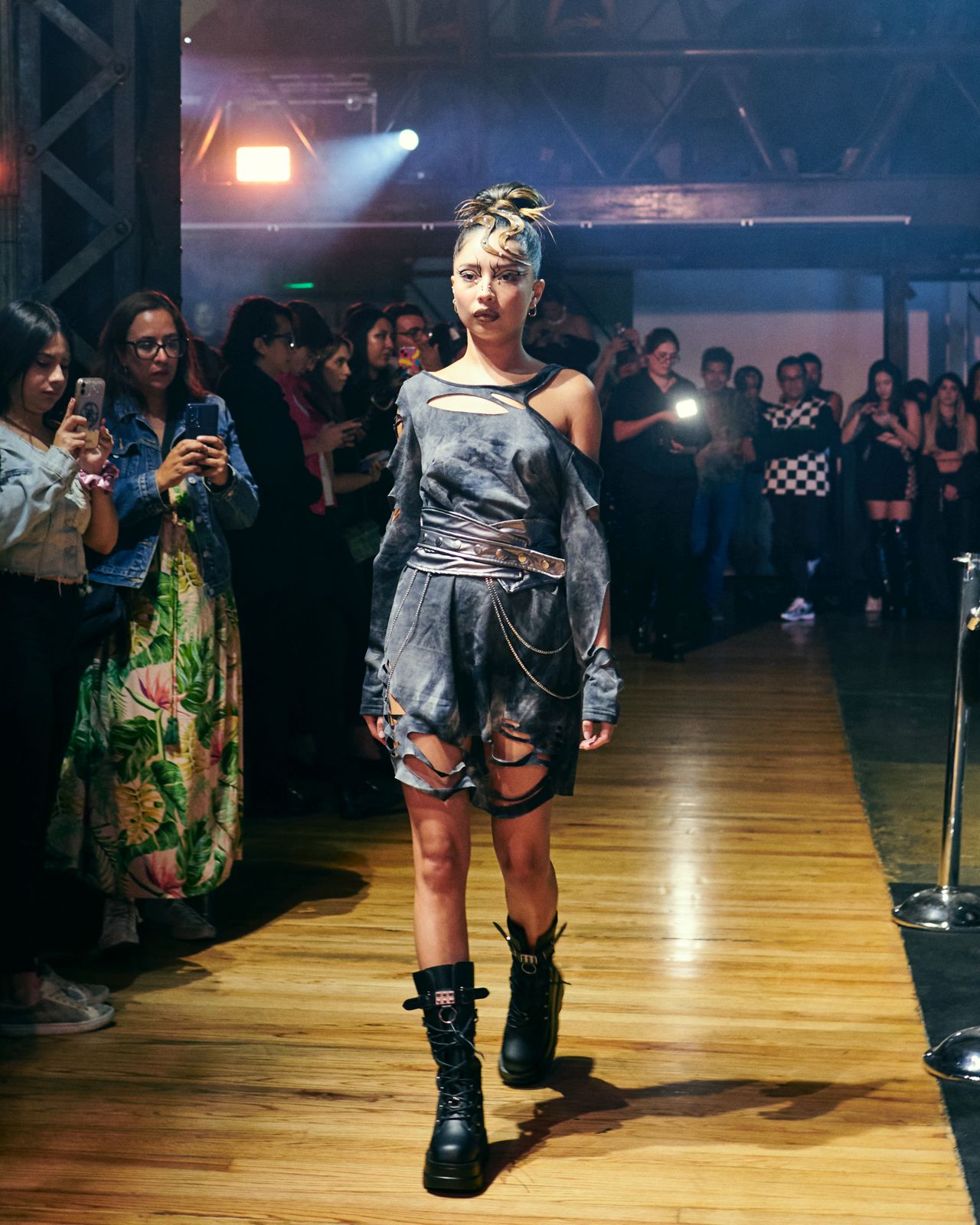 The Weird Market: Justo transformamos todas las texturas que utilizamos con ella, parte de la inspiración es el punk, parte es el estilo postapocalíptico muy “Madmax”, entonces basado en eso eran demasiadas texturas que reflejan la metamorfosis de la antigua época de Danna a ésta; entonces hicimos una lluvia de ideas es acoplar todo esto para llevarlo a las prendas, por eso van a encontrar muchas texturas, muchos degradados, colores, formas, etc.