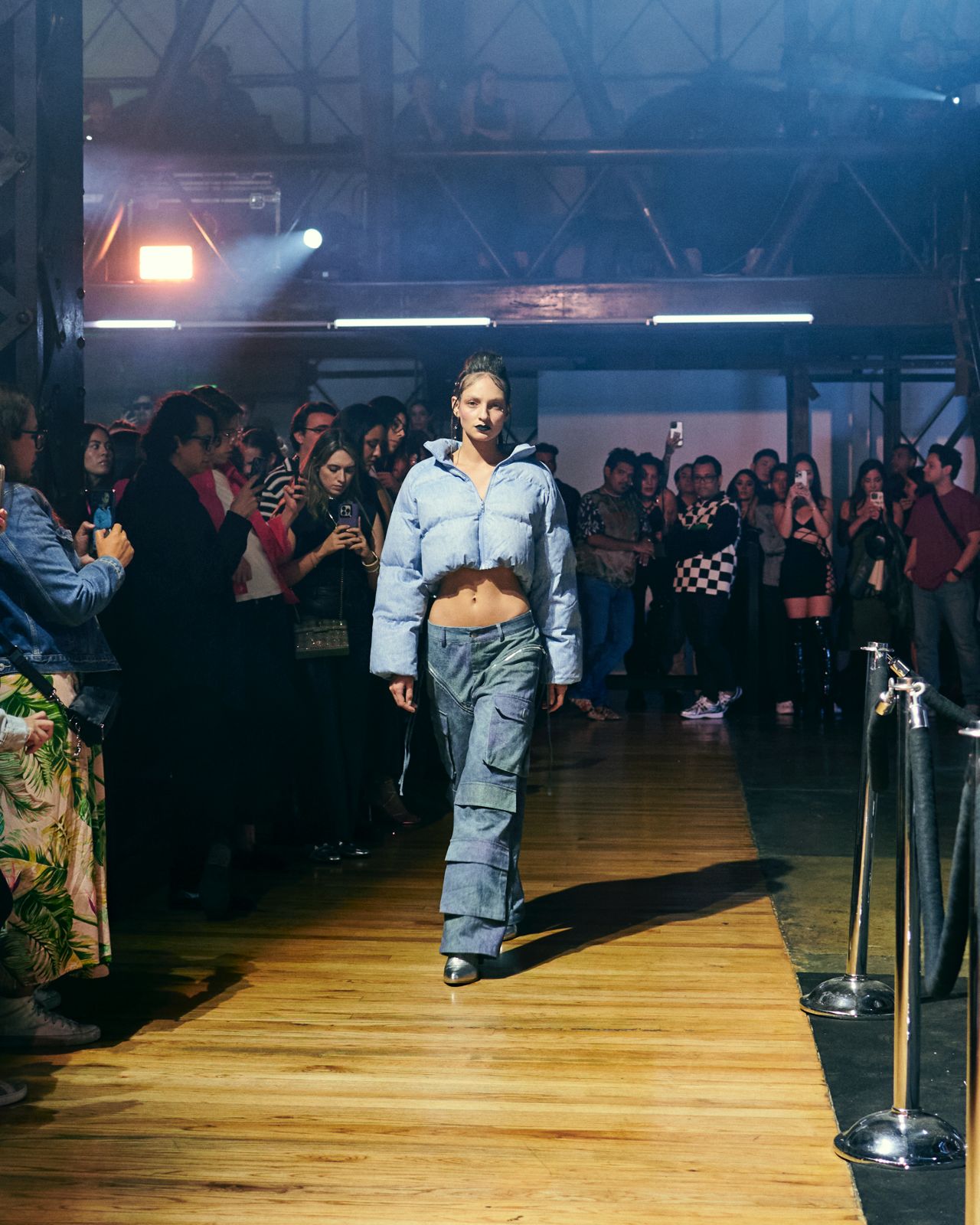 The Weird Market: Justo la última pieza que hicimos con ella antes de esto fue en los MTV Miaw que usó un vestido blanco de corset y falda, hizo una presentación con Moderatto, fue la última pieza que consideramos que fue la transición, luego llegó el video de “XT4S1S” y ese ya fue con el que totalmente hizo un cambio, ahí empezamos a trabajar con todas estas texturas de media sobre media desgarradas sobre denim, ella quería ver reflejo de luz en la prenda, que tuviera diferentes profundidades y justo fue lo que hicimos pero lo transformamos a estampados, haciéndolo fast fashion también y fácil de crear para moda, porque las prendas demasiado complejas a veces también elevan los costos y queríamos también que todos tuvieran la posibilidad de tener un pedacito de Danna.