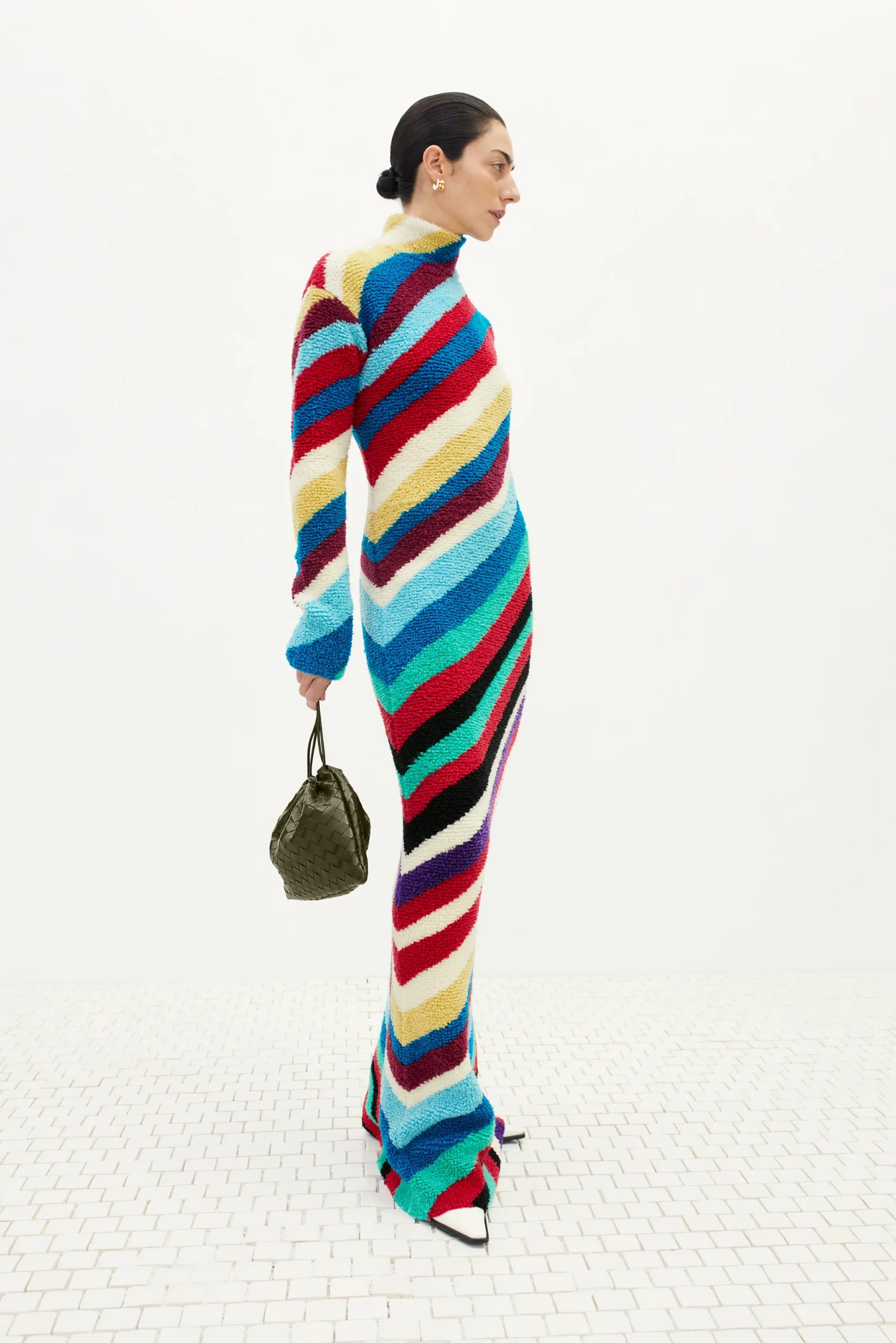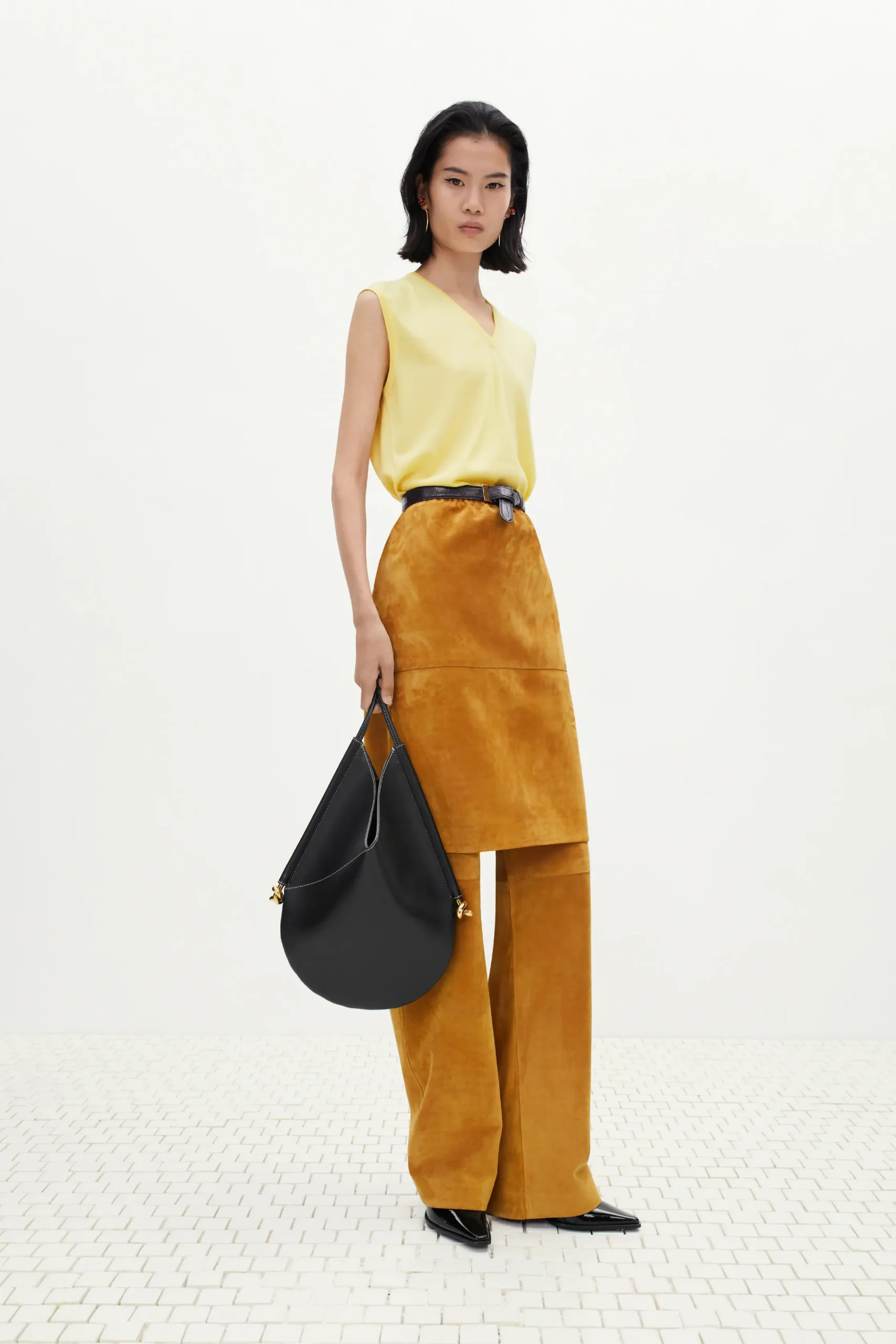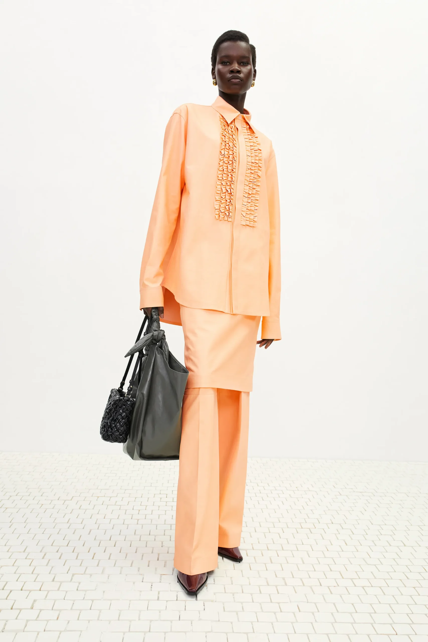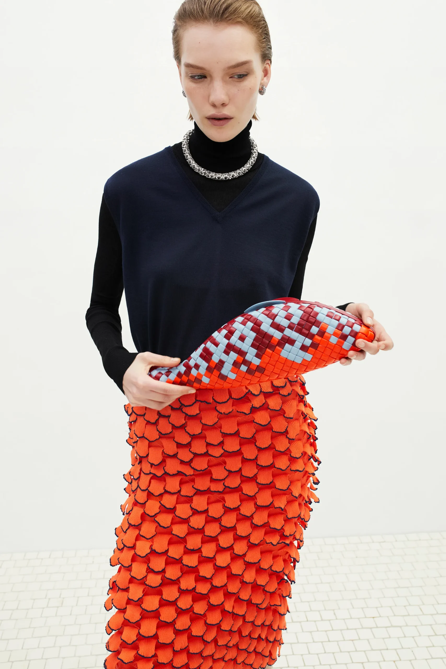 Matthieu capta la idea de ofrecer lujo, sin ser tan excesivos. Es evidente que es autentico y la diversidad de estilos, seduce sin límite alguno. El atrevido refinamiento enloquece con la sedosa seguridad que otorga aquel suede peacoat, los pantsuits con matices pasteles, aquella escamosa falda naranja o el frondoso leopard leather coat – eso es, la actitud Bottega Veneta. Es humana, colorida y armoniosa como un naciente arcoíris, persuade con su ritmo y todos quieren vibrar en el.