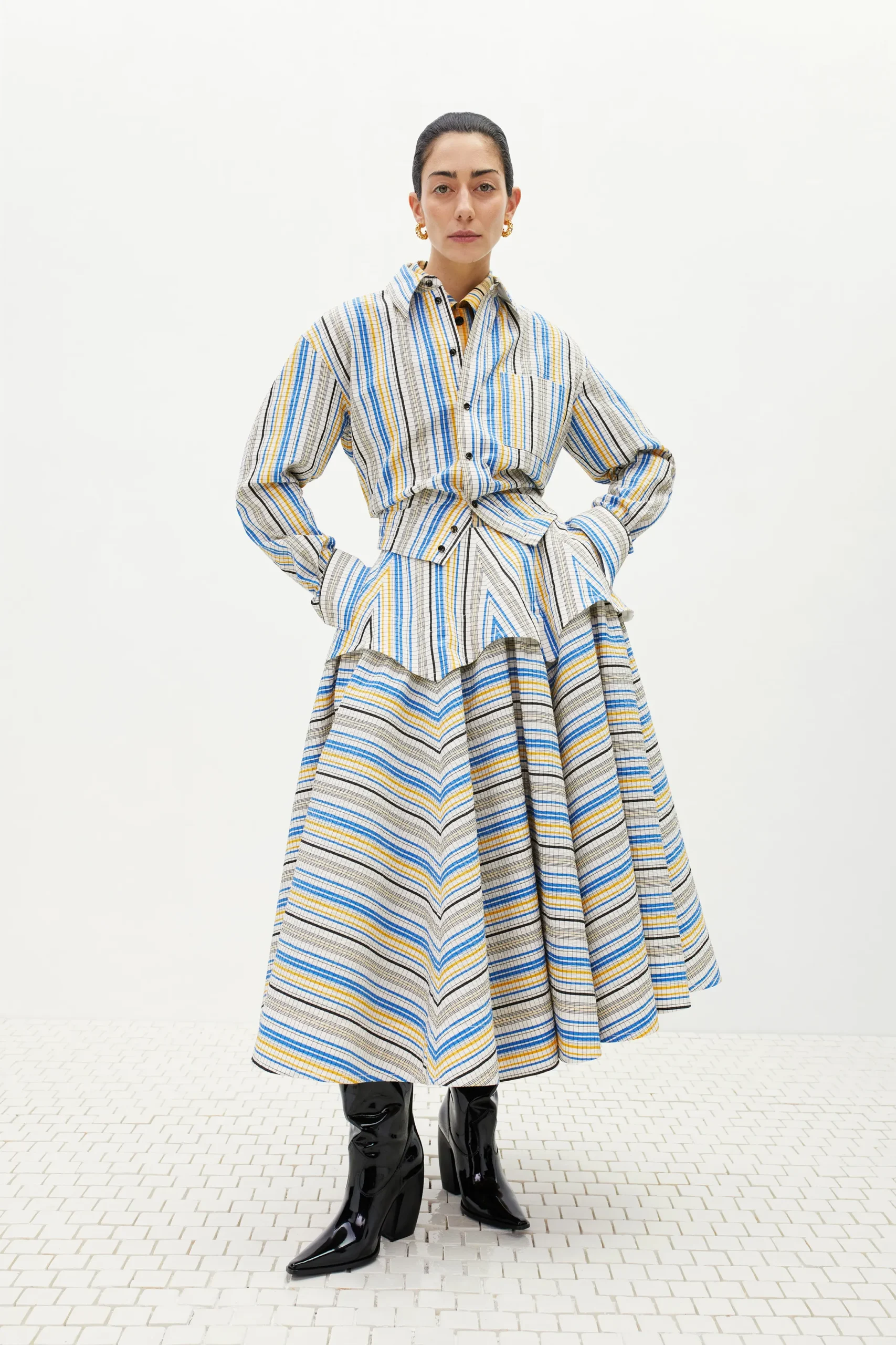 El por qué nos atrae tanto sus voluminosas y comunes propuestas, es debido a que vanagloria la cotidianidad, es decir, puede que luzca sencilla aquella camisa masculina de rayas y cuadros, pero no lo es. La genialidad radica en el estilismo impuesto por Blazy, el como portar una falda de pliegues o una falda sobre unos pantalones de cashmere – modifica la perspectiva del vestir diario, eleva lo que consideramos habitual o corriente. Se fundamenta en sucesos y personajes de la historia que fortalecen sus ideales de mejorar el presente, así notamos que los 60s, 70s y Andy Warhol, representan un lado nada convencional, que atrae al creativo a no ser como el resto. La vida diaria no puede ser aburrida ni tediosa. Matthieu la ilumina con una genial simplicidad ligada a una práctica artesanal deliciosa paleta de colores. El intrecciato le da sentido a la combinaciones sugeridas.