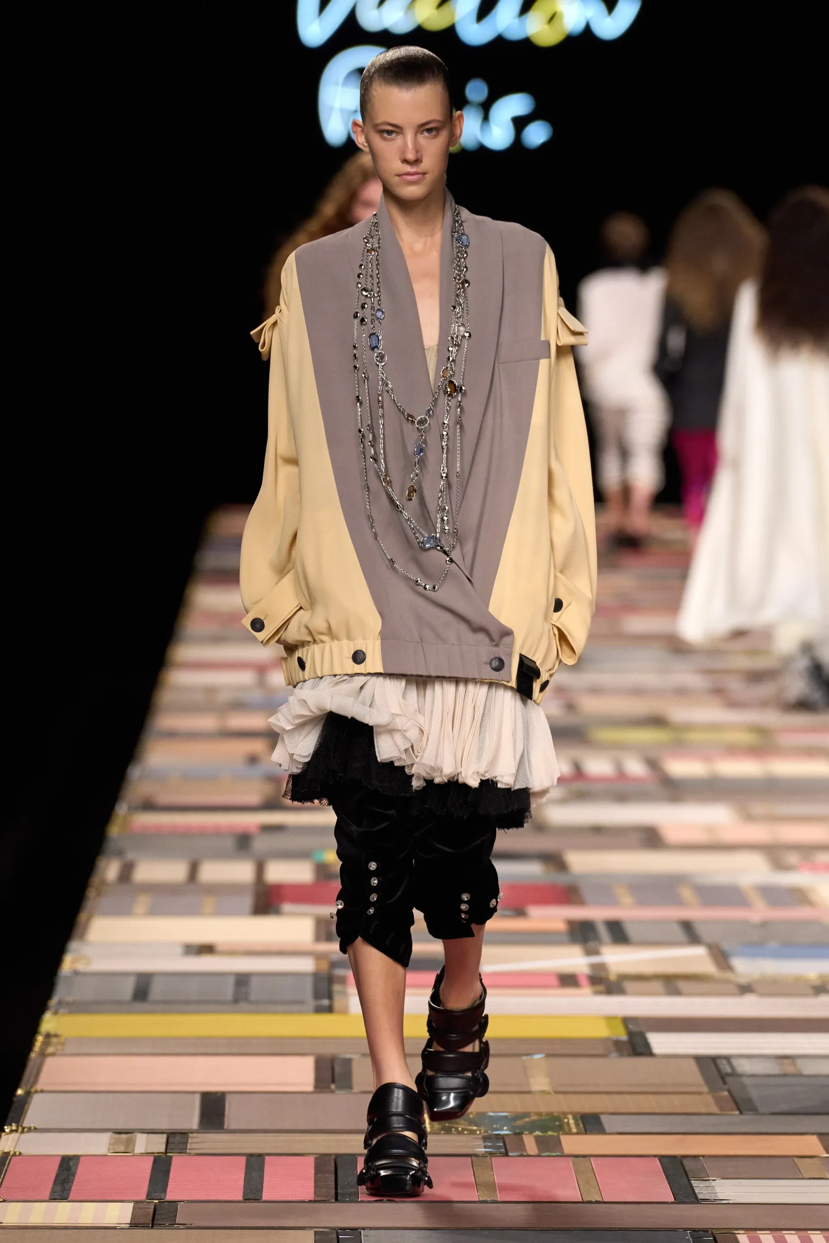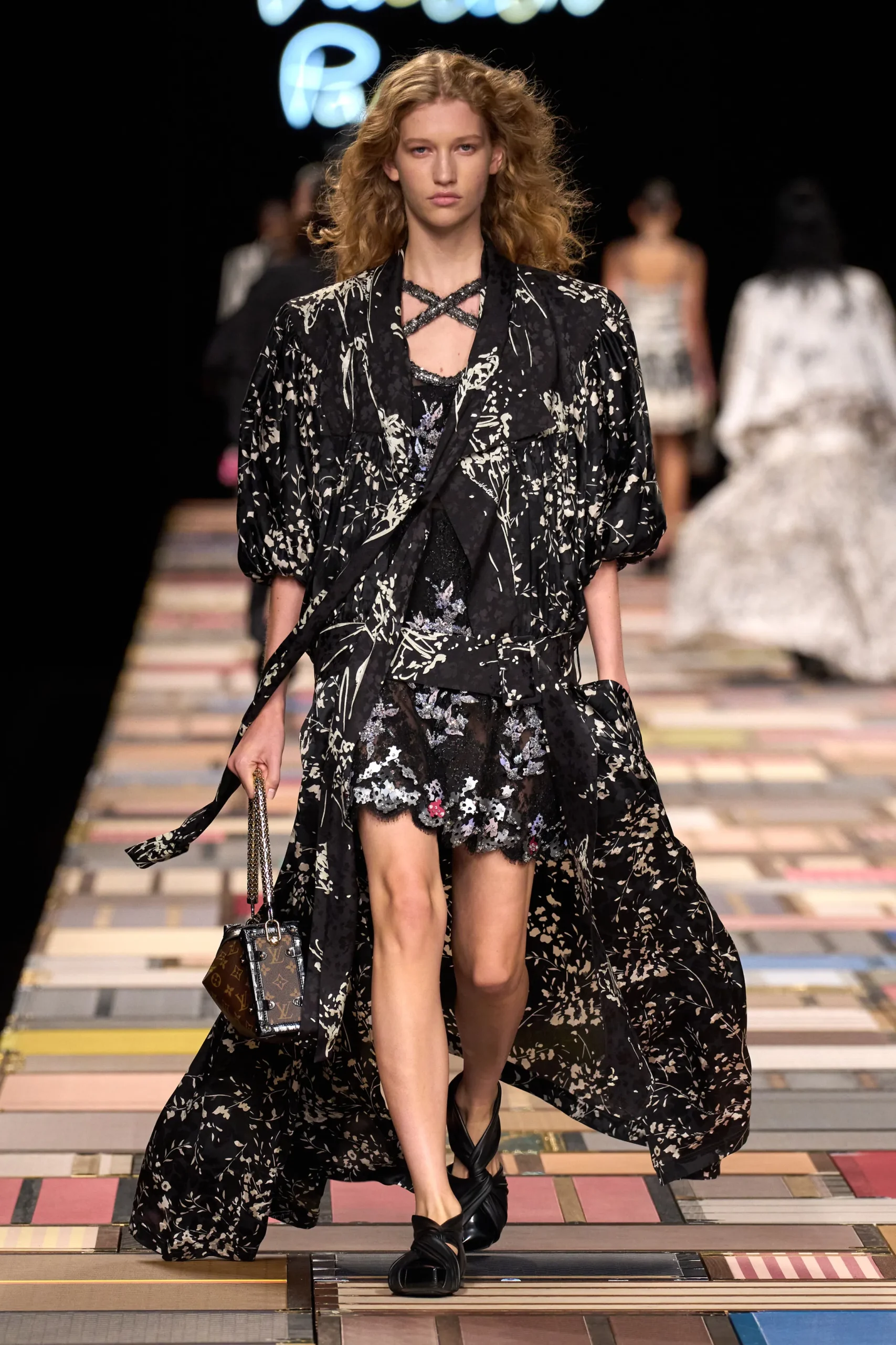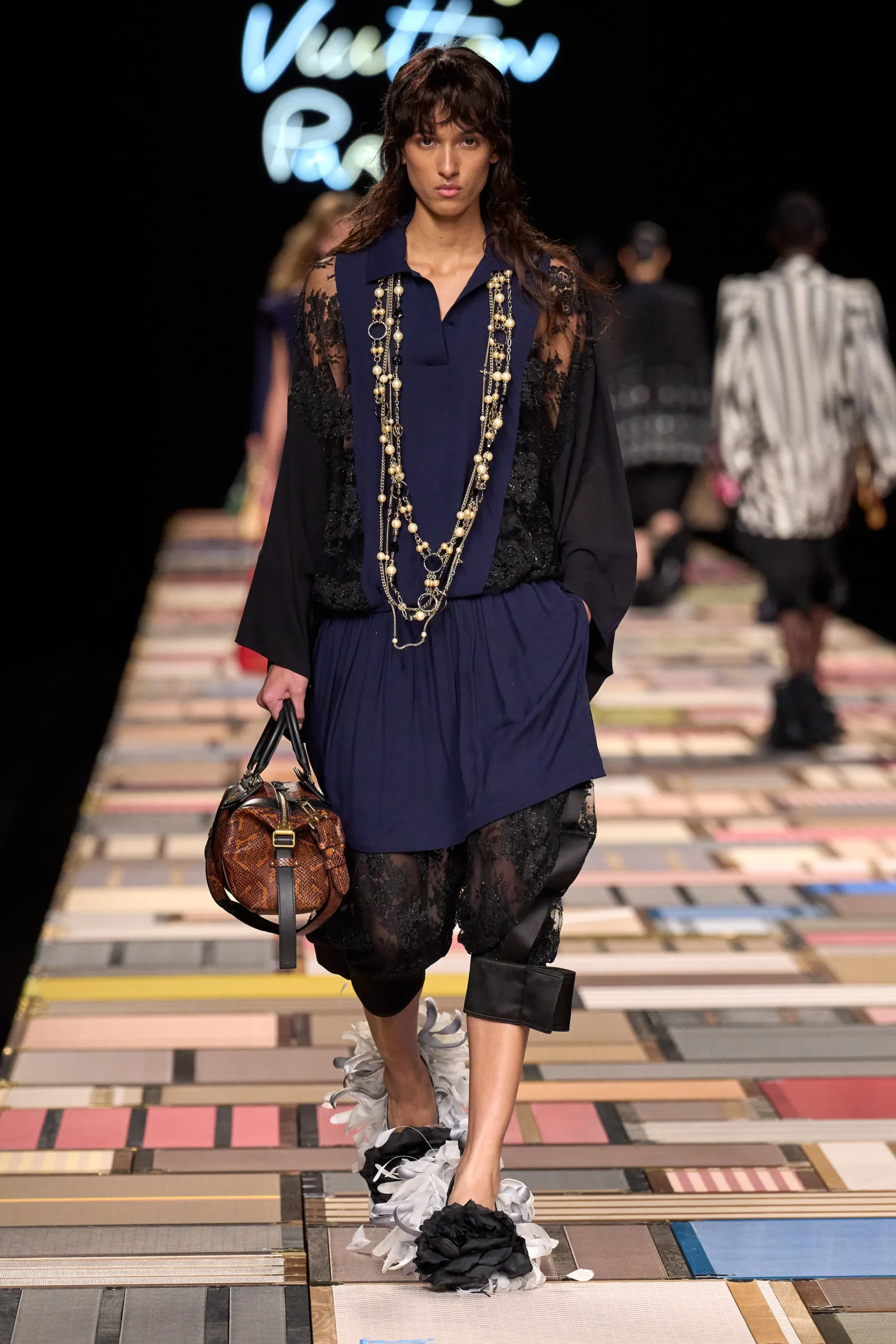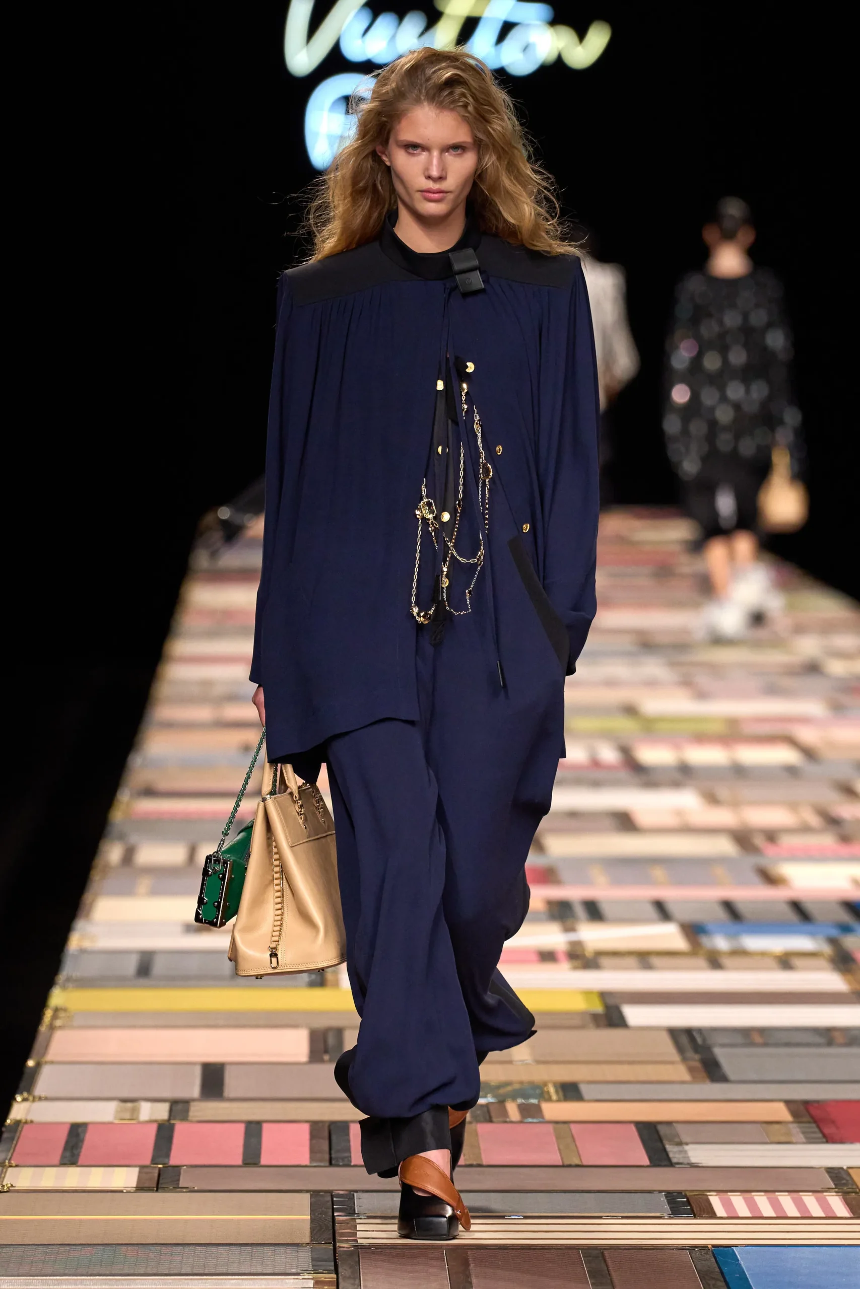 El oversize milimétricamente estático y valeroso, se ha convertido en un sello personal de Louis Vuitton, en su fase exquisitamente viajera. Celebrando su décimo aniversario en la maison, peligrosamente, sabotea lindamente y energéticamente, con sus pantalones pijama o de ciclista de maratón y gruesas sandalias, que evocaban un íntimo pasado, rebosante de ligera fluidez con estructuras arquitectónicas, reflejadas en eclécticos camisones drop-waist, llenos de estampados florales y adheridas piedras de río.