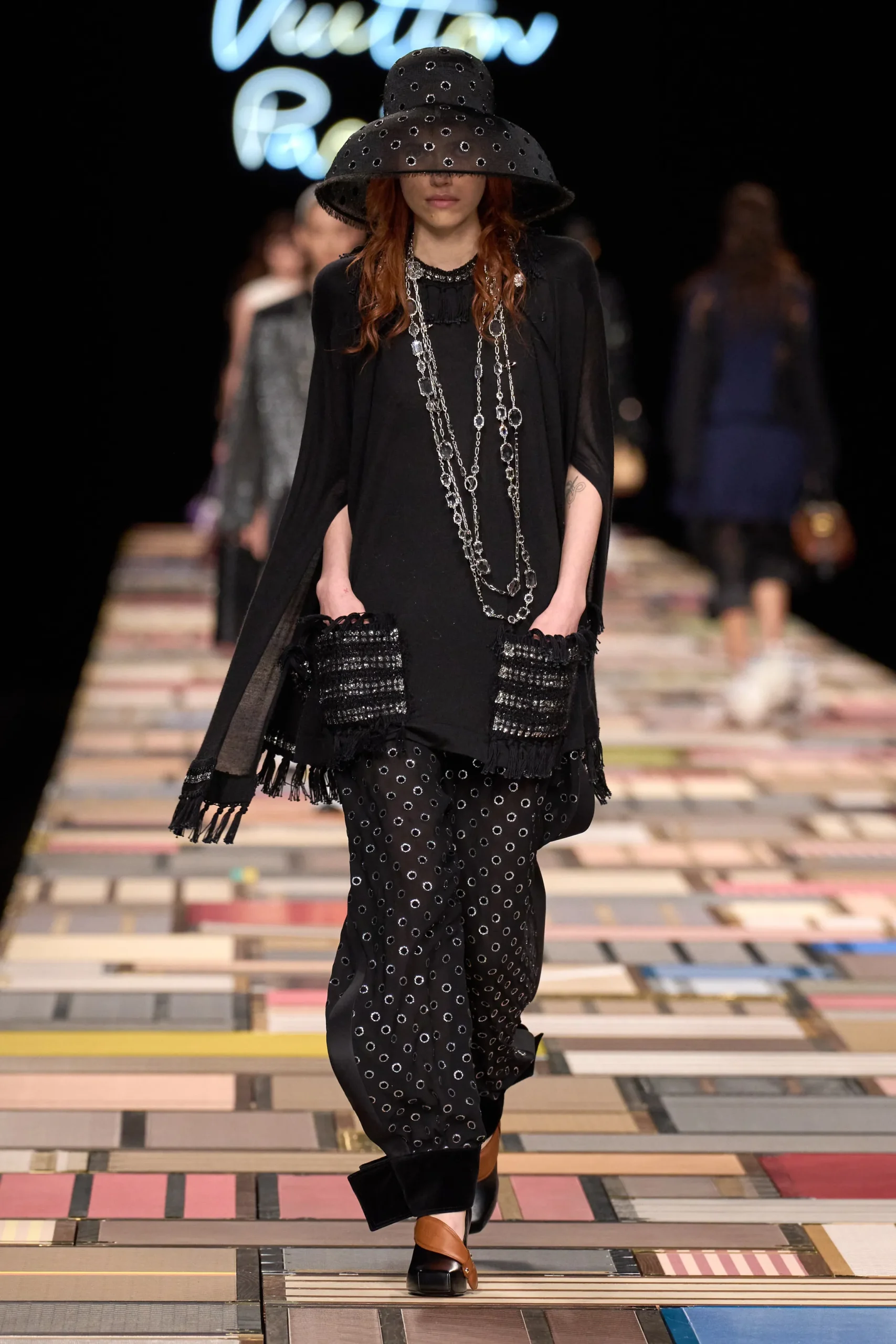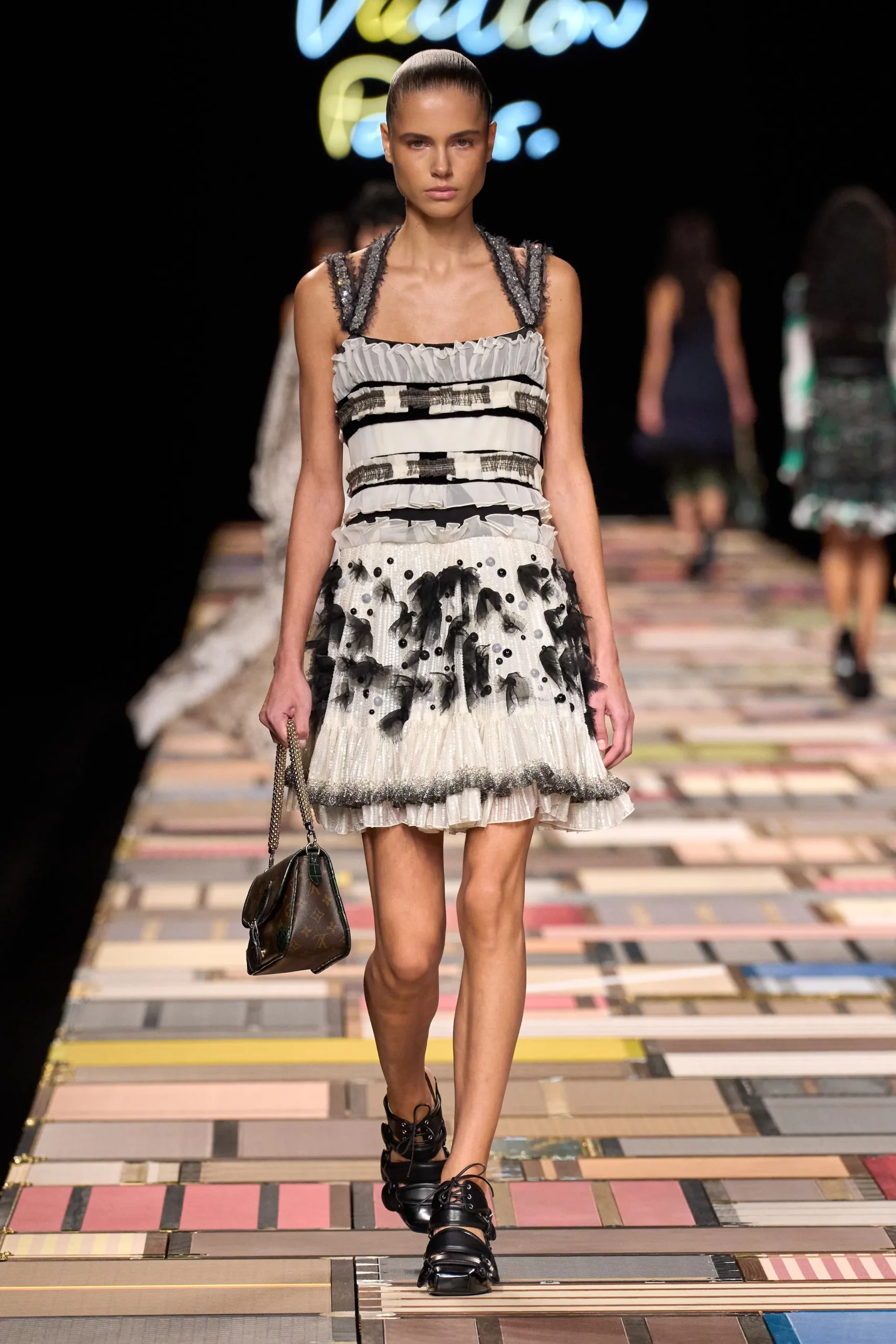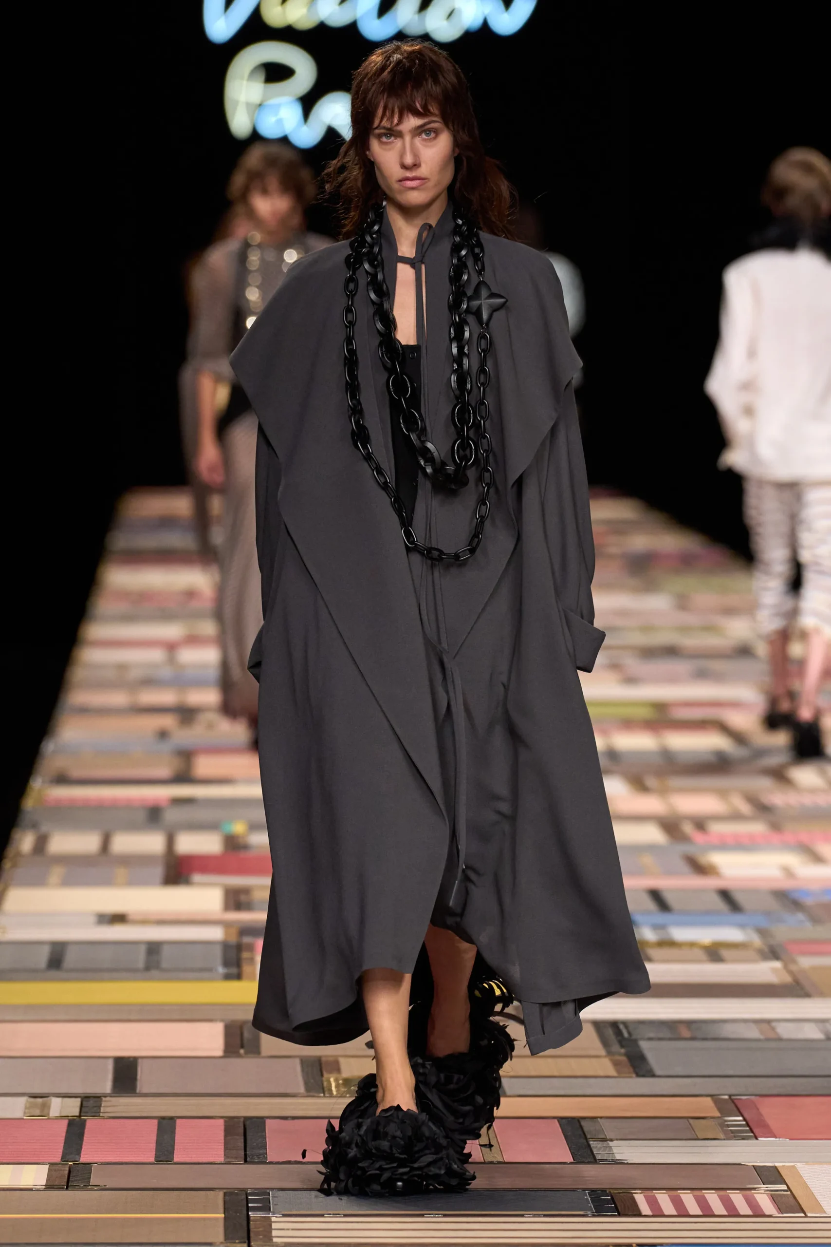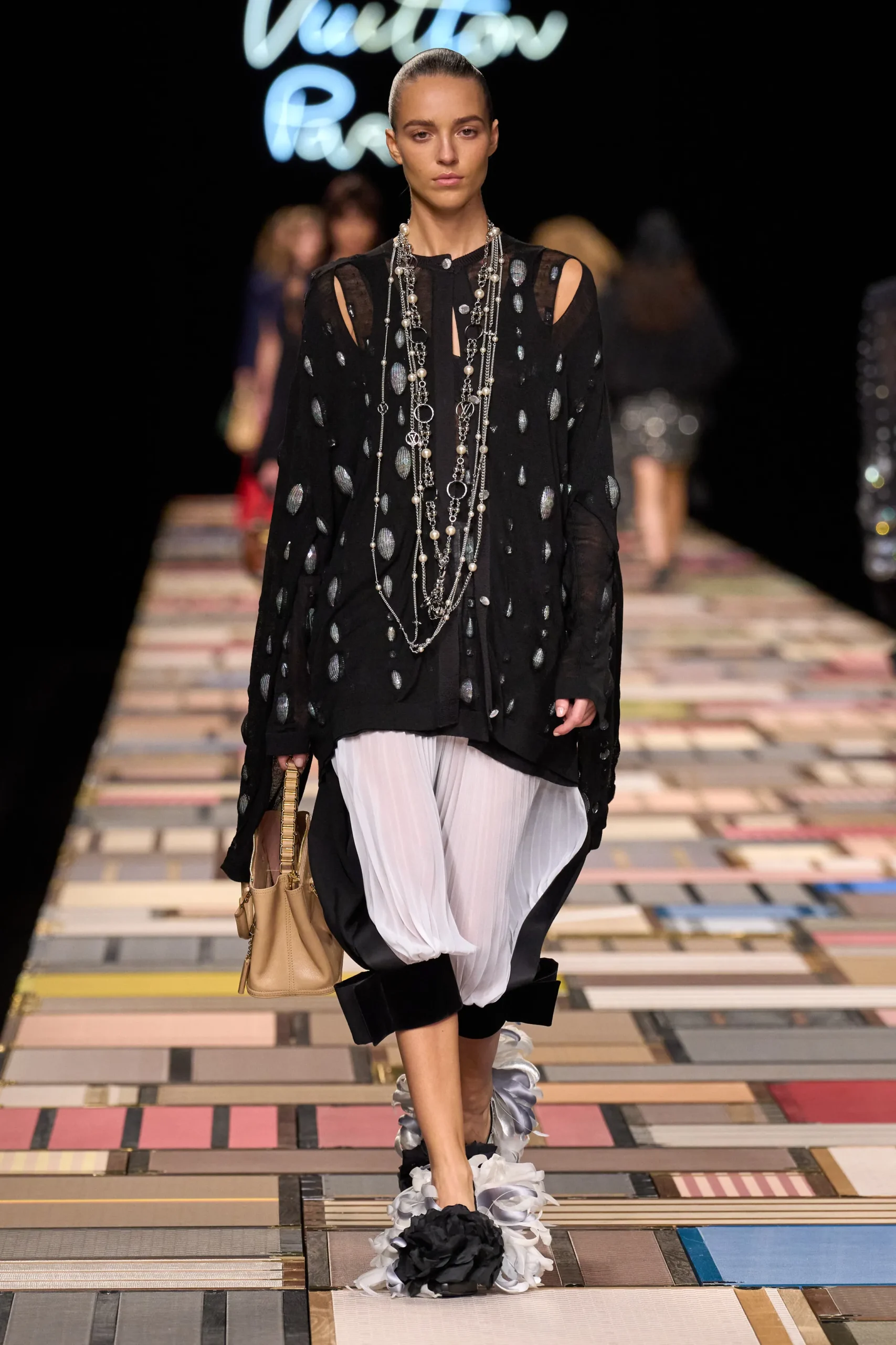 El oversize milimétricamente estático y valeroso, se ha convertido en un sello personal de Louis Vuitton, en su fase exquisitamente viajera. Celebrando su décimo aniversario en la maison, peligrosamente, sabotea lindamente y energéticamente, con sus pantalones pijama o de ciclista de maratón y gruesas sandalias, que evocaban un íntimo pasado, rebosante de ligera fluidez con estructuras arquitectónicas, reflejadas en eclécticos camisones drop-waist, llenos de estampados florales y adheridas piedras de río.