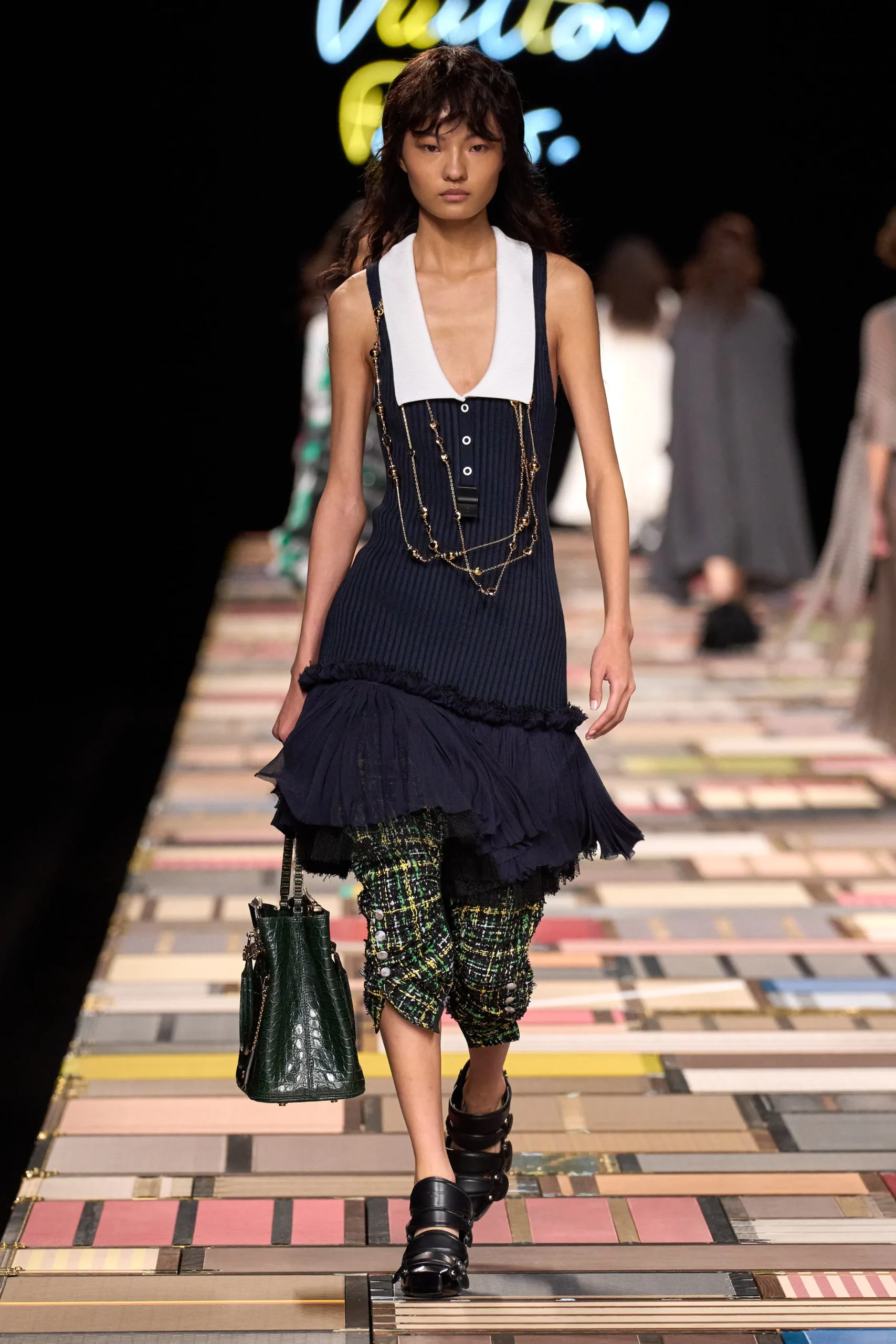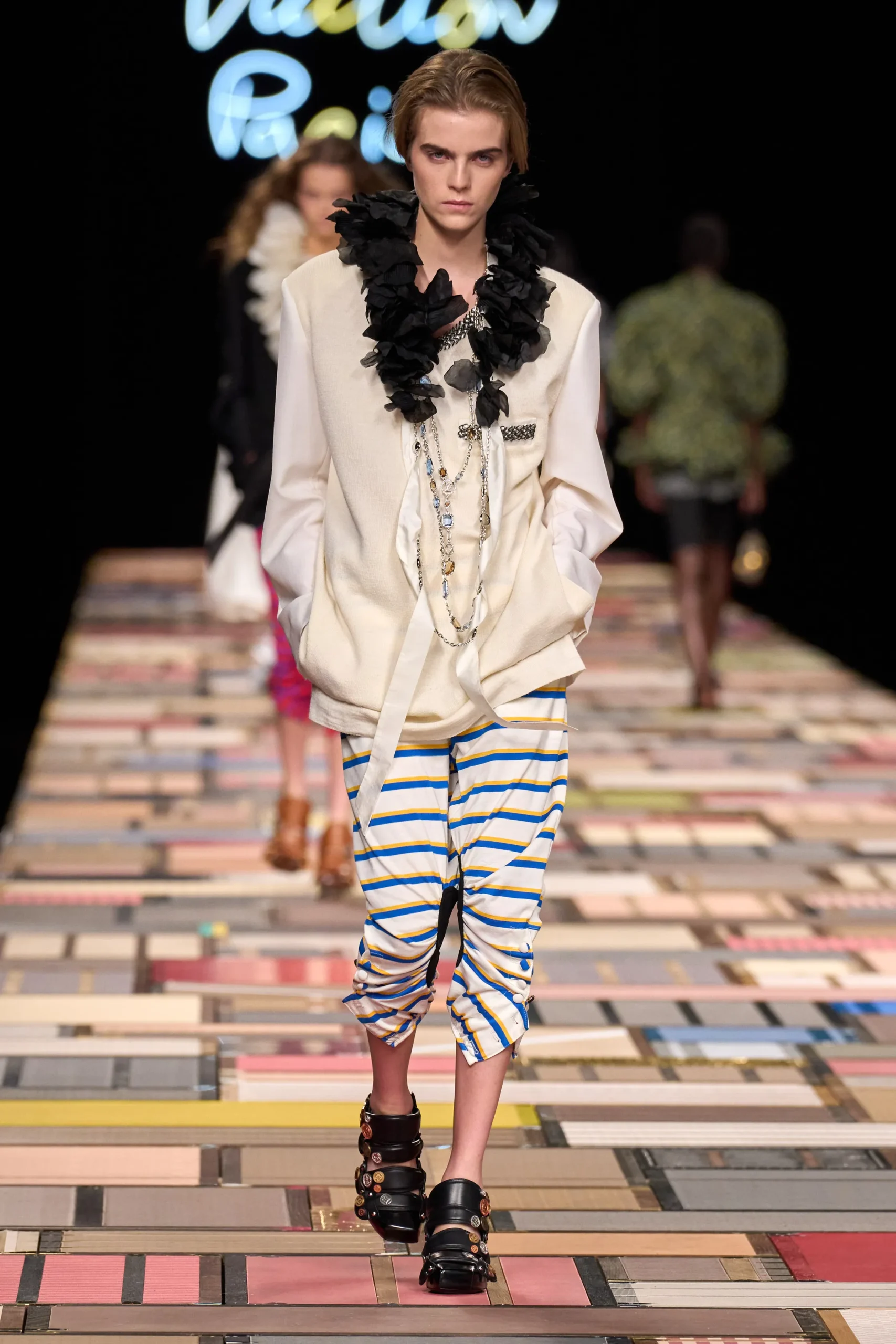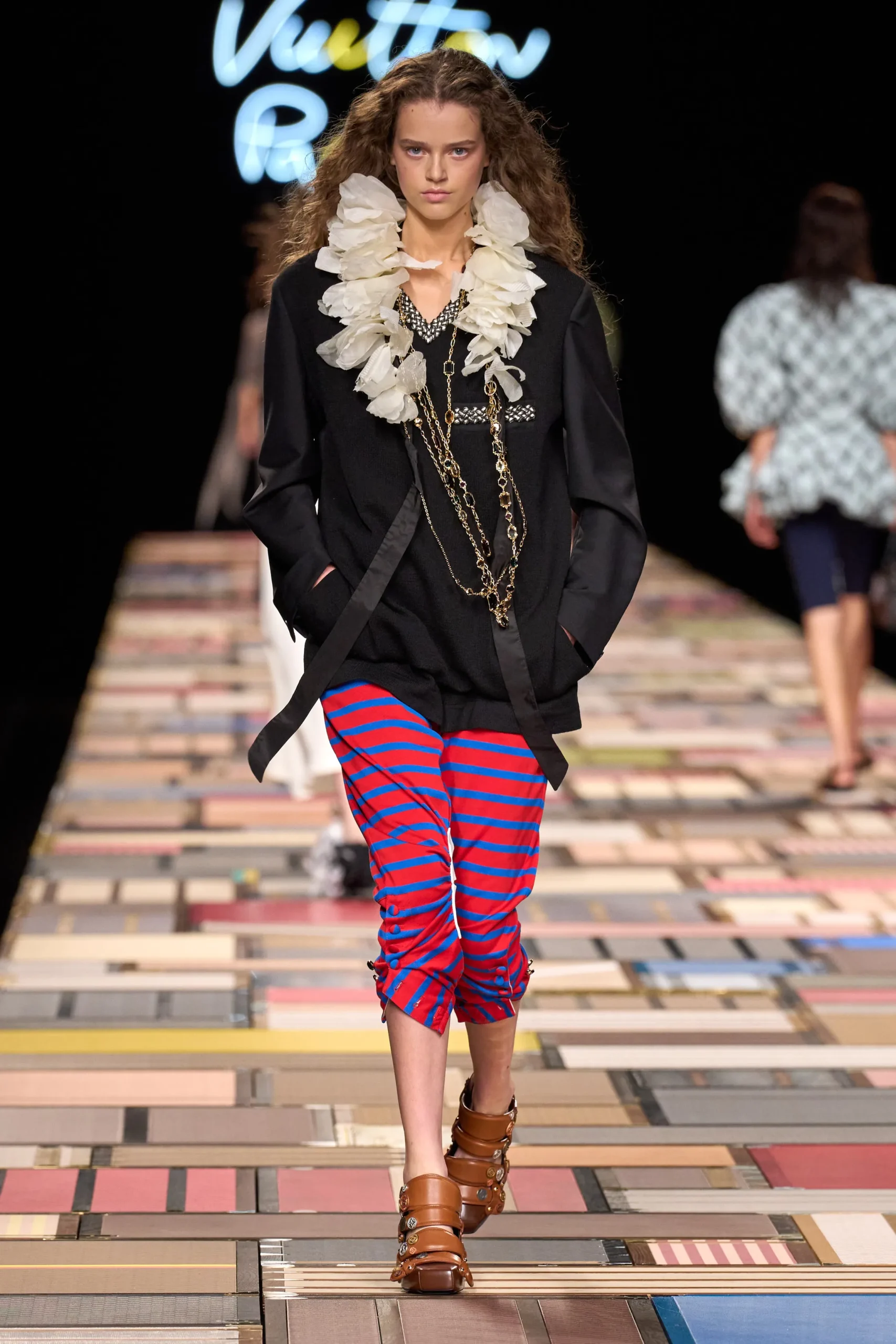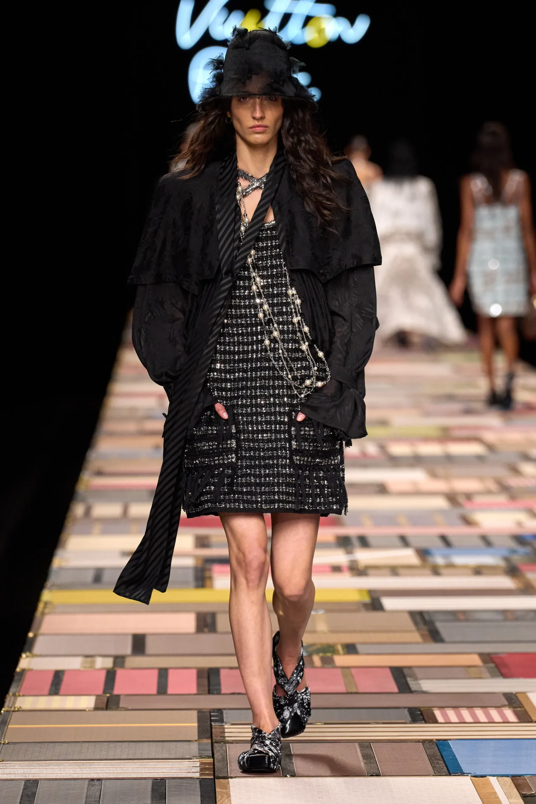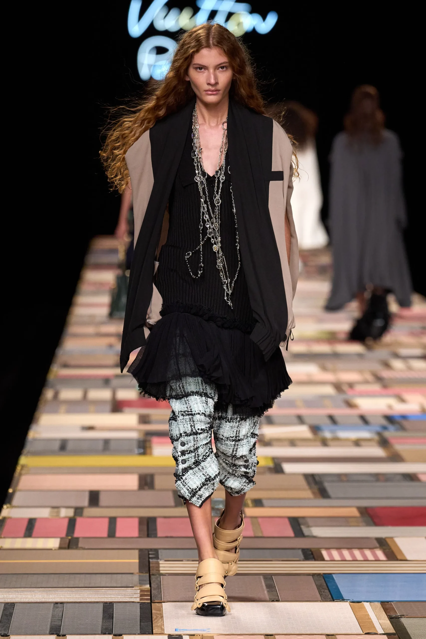 El oversize milimétricamente estático y valeroso, se ha convertido en un sello personal de Louis Vuitton, en su fase exquisitamente viajera. Celebrando su décimo aniversario en la maison, peligrosamente, sabotea lindamente y energéticamente, con sus pantalones pijama o de ciclista de maratón y gruesas sandalias, que evocaban un íntimo pasado, rebosante de ligera fluidez con estructuras arquitectónicas, reflejadas en eclécticos camisones drop-waist, llenos de estampados florales y adheridas piedras de río.