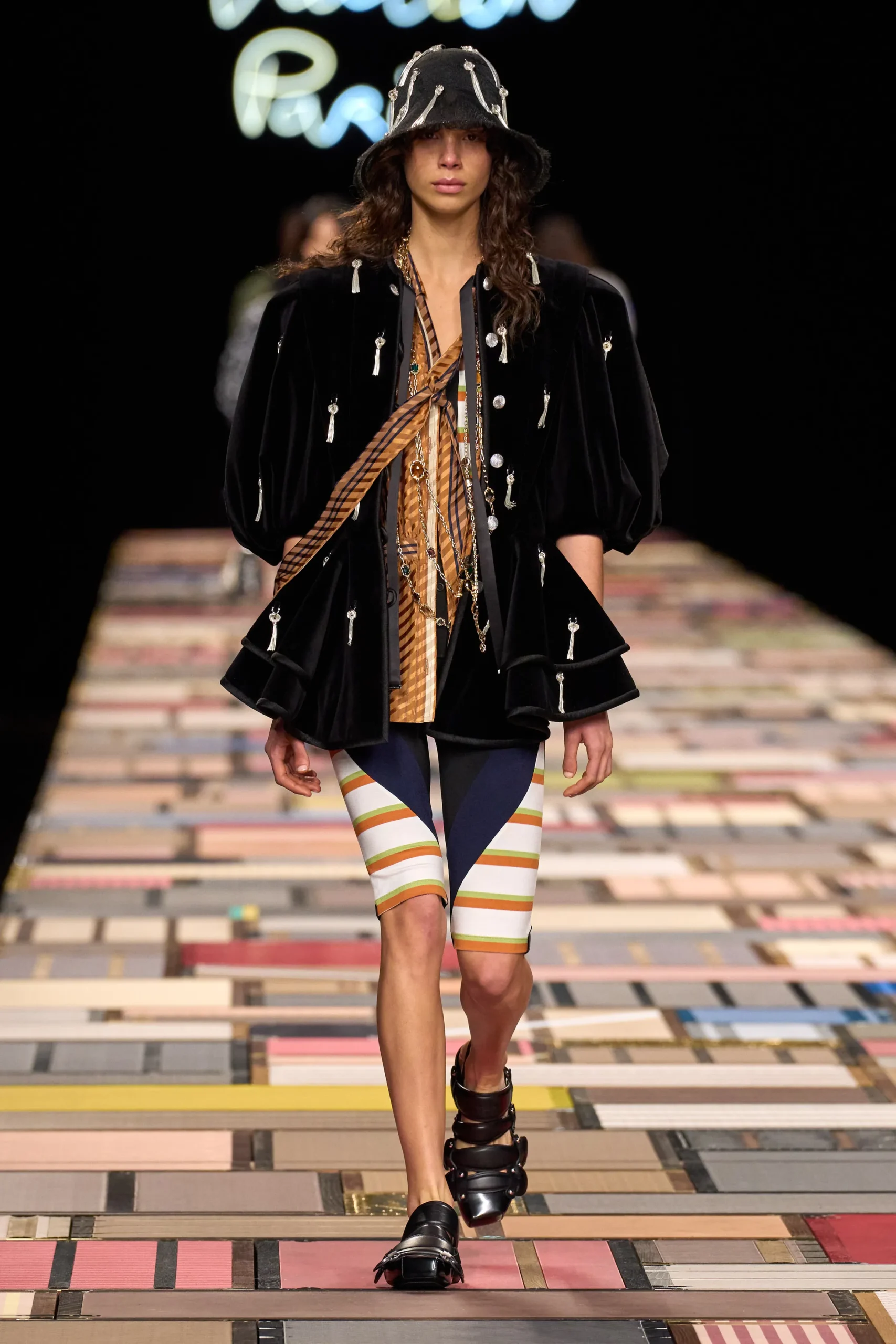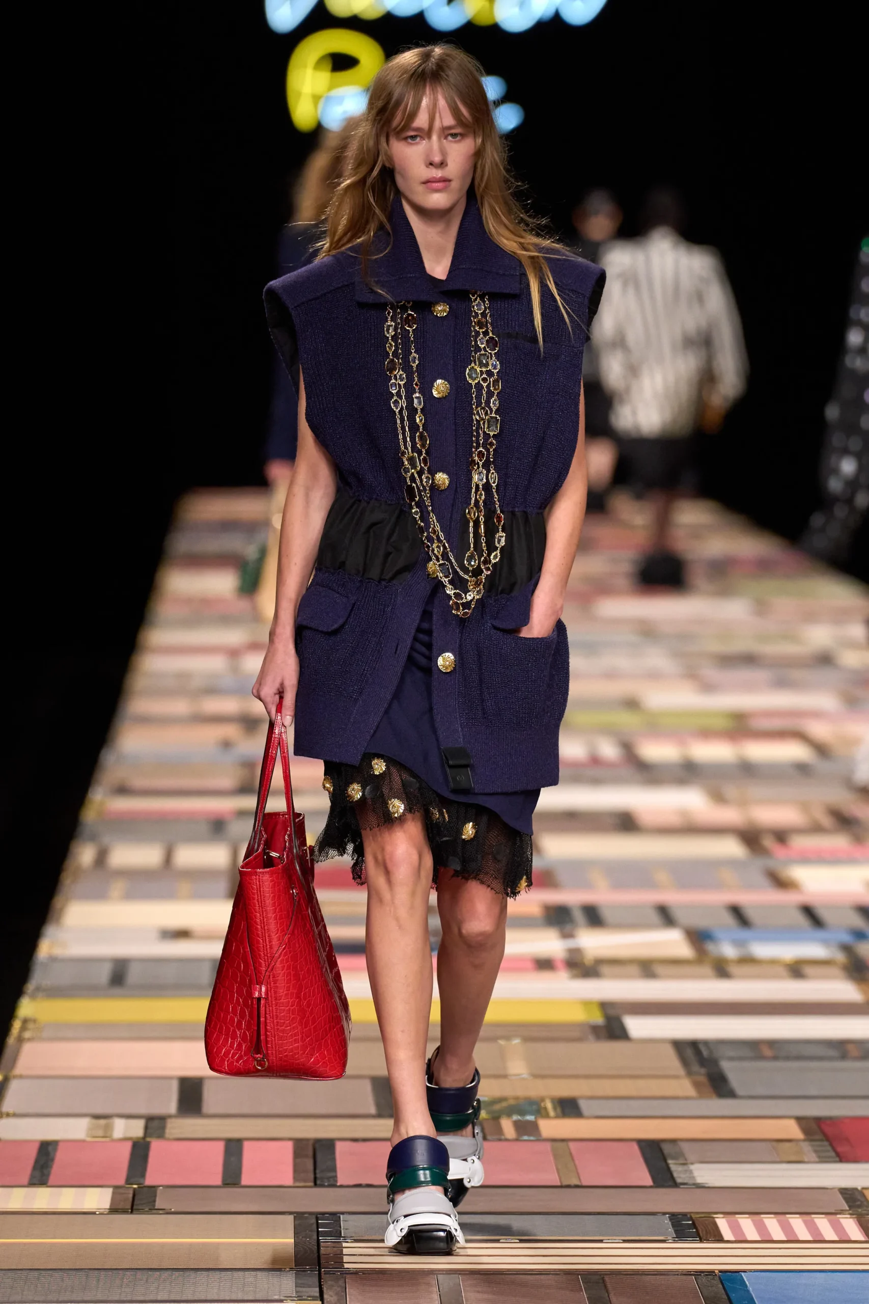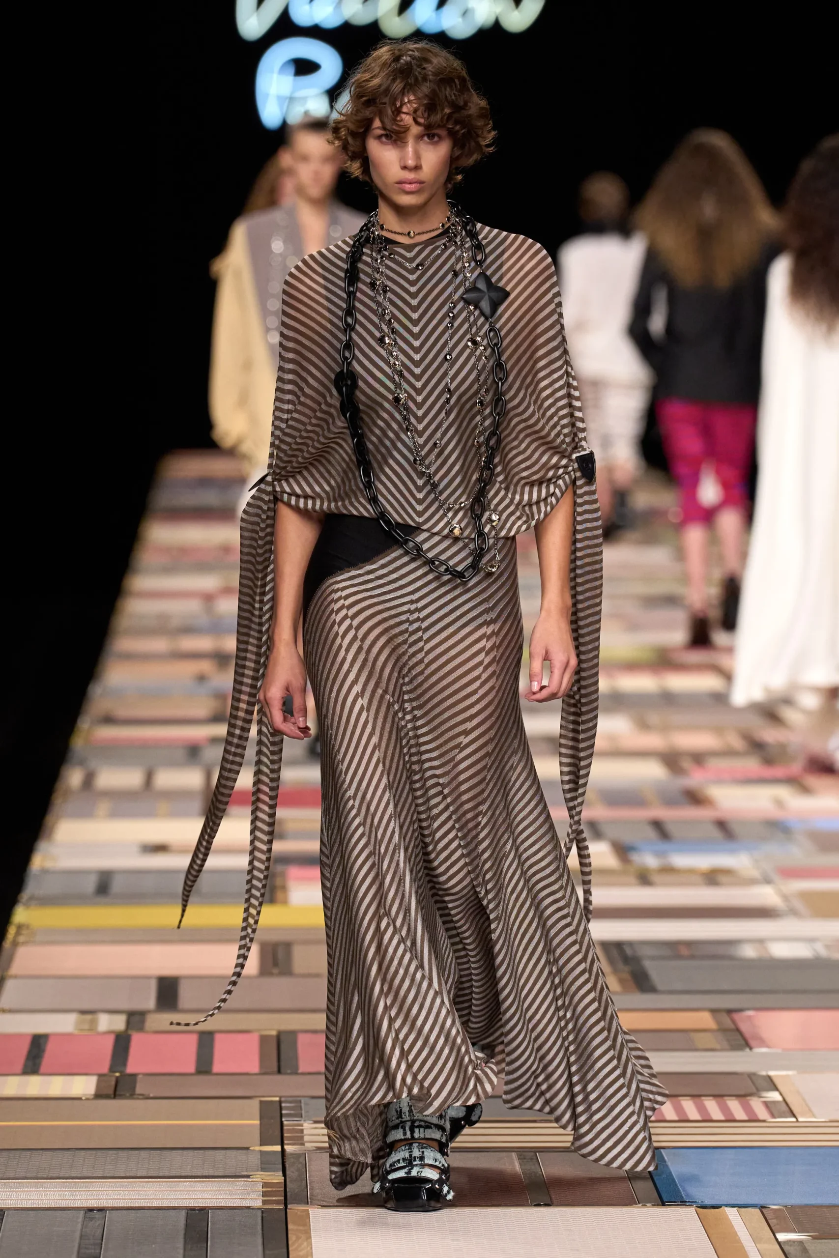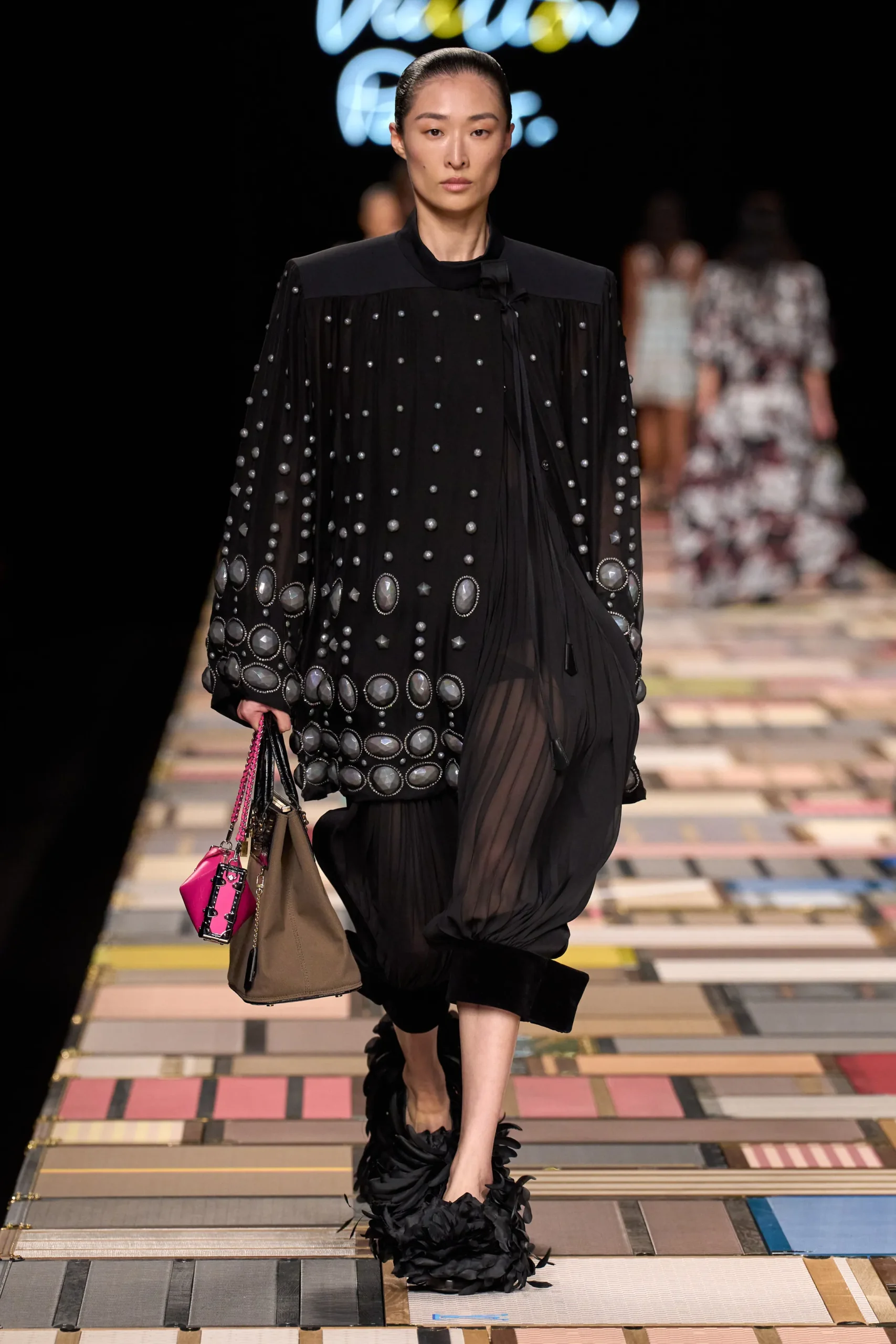 El oversize milimétricamente estático y valeroso, se ha convertido en un sello personal de Louis Vuitton, en su fase exquisitamente viajera. Celebrando su décimo aniversario en la maison, peligrosamente, sabotea lindamente y energéticamente, con sus pantalones pijama o de ciclista de maratón y gruesas sandalias, que evocaban un íntimo pasado, rebosante de ligera fluidez con estructuras arquitectónicas, reflejadas en eclécticos camisones drop-waist, llenos de estampados florales y adheridas piedras de río.