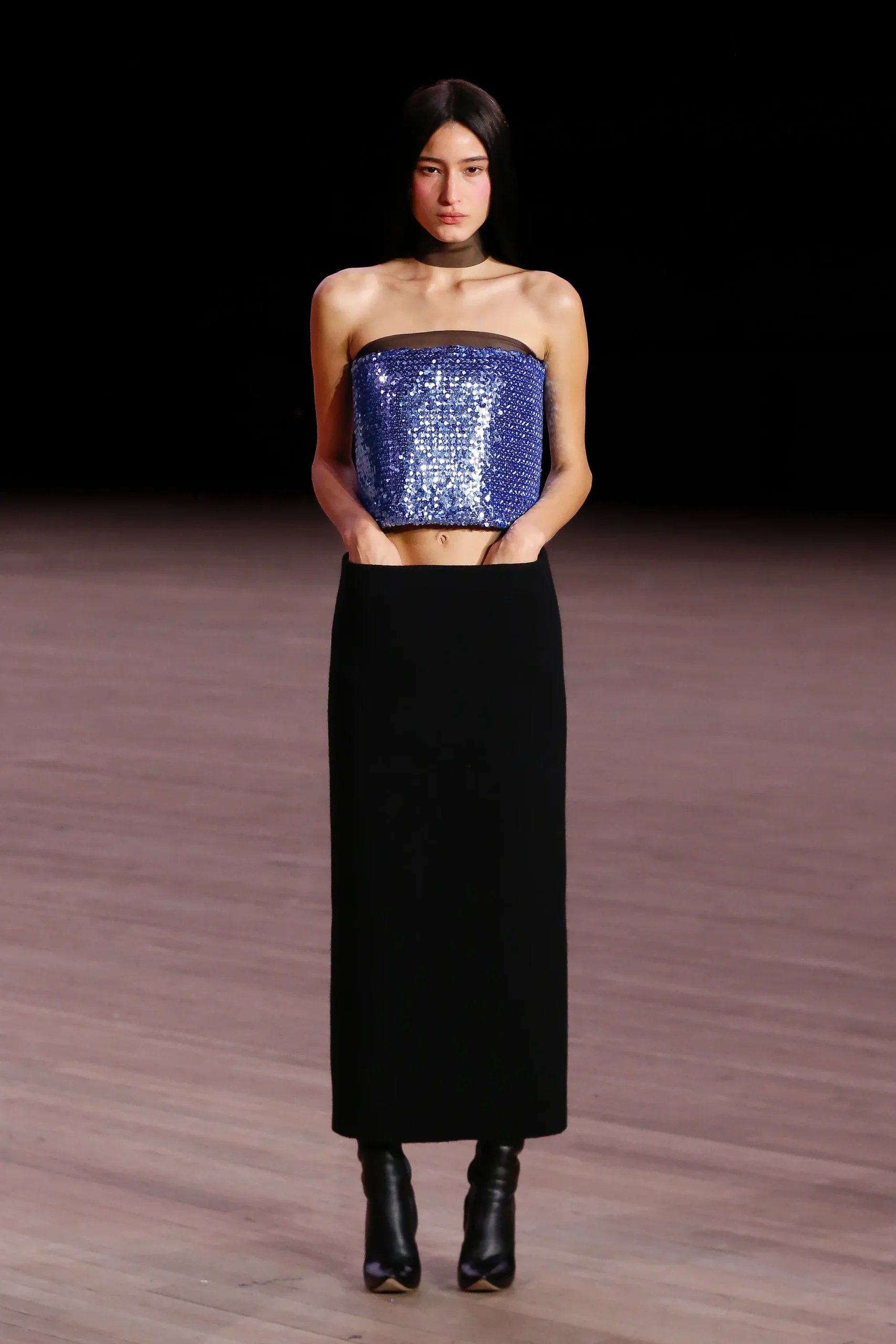Algo muy nerdy como poético fue el gesto de acreditar a los diseñadores y tiendas que los inspiraron. La sutil belleza constructiva boogie-woogie de Yves Saint Laurent resplandeció en los mini vestidos de corte imperio y abrigos abotonados por la espalda. También hubo referencias a la pionera línea de ropa urbana X-girl, así como a Stüssy, visibles con micro faldas de lentejuelas y tops acolchonados que evocaron cinturones obi o incluso el envase de un labial. Helmut Lang fue invocado con la simplicidad de acogedoras tank tops y faldas de mismo calibre estético.