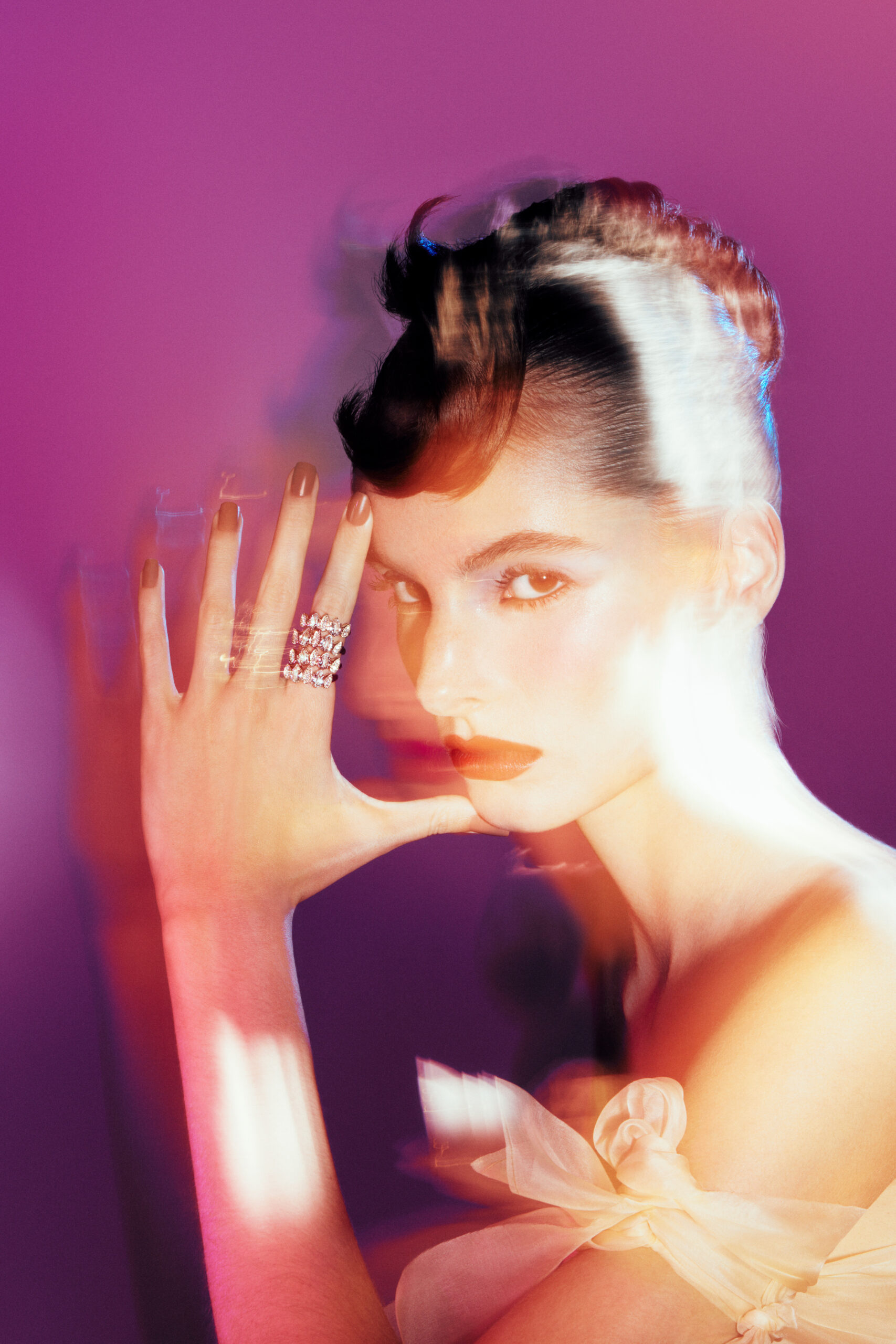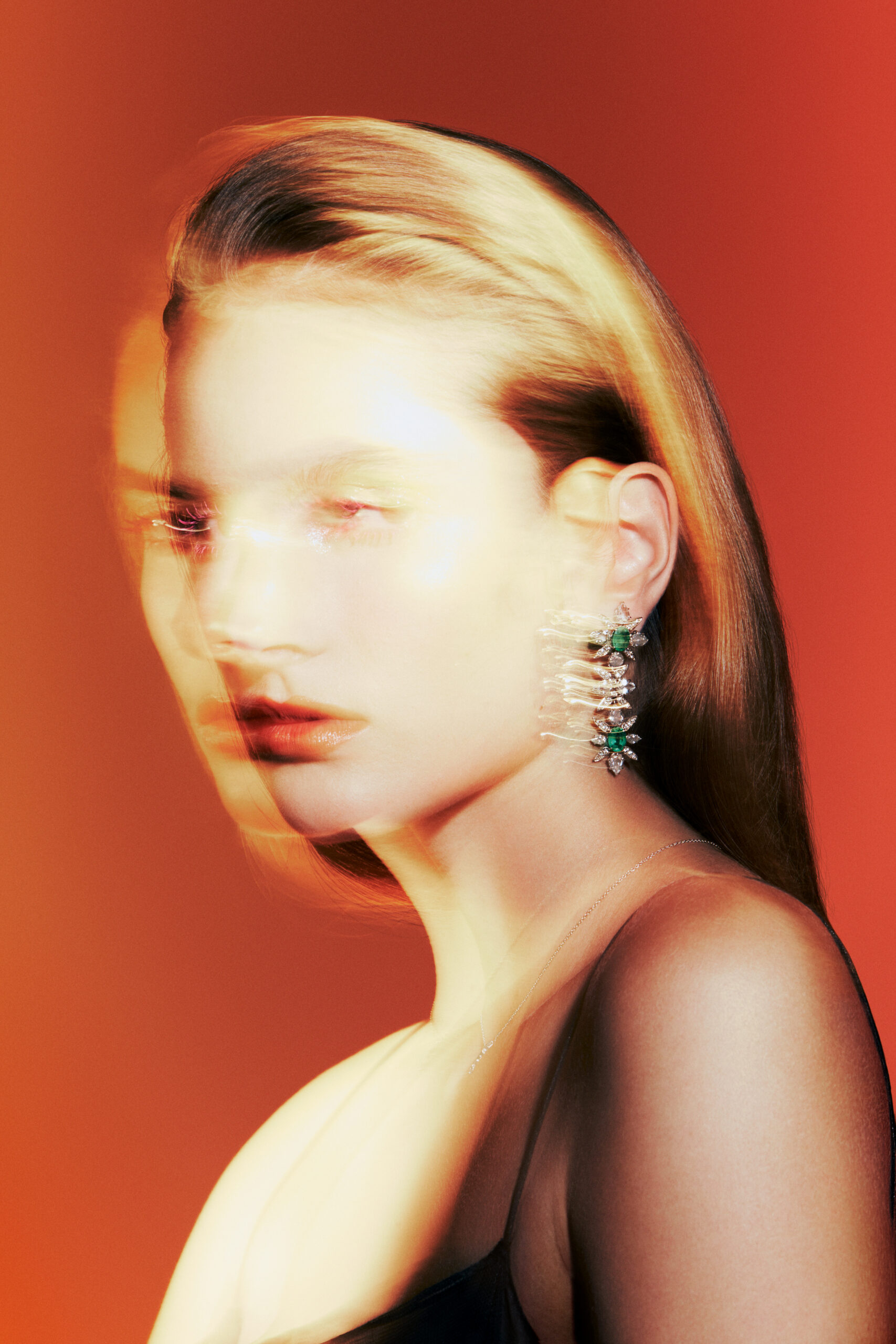 Una delicadeza tanto minimalista, como surrealista o intensamente maximalista, coquetean descaradamente con la energía luminosa de aquellos diamantes fragmentados con la energía cinética del Oro Noble de 18K o la mera opulencia del verde bañando esmeraldas flanqueadas por cristales de roca. Se percibe una intensiva rigidez en una modernidad insectívora.