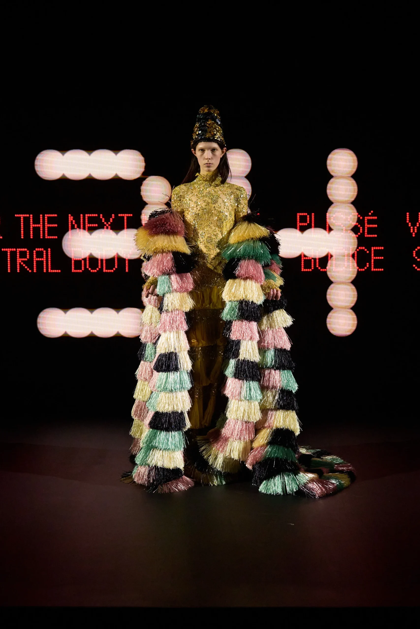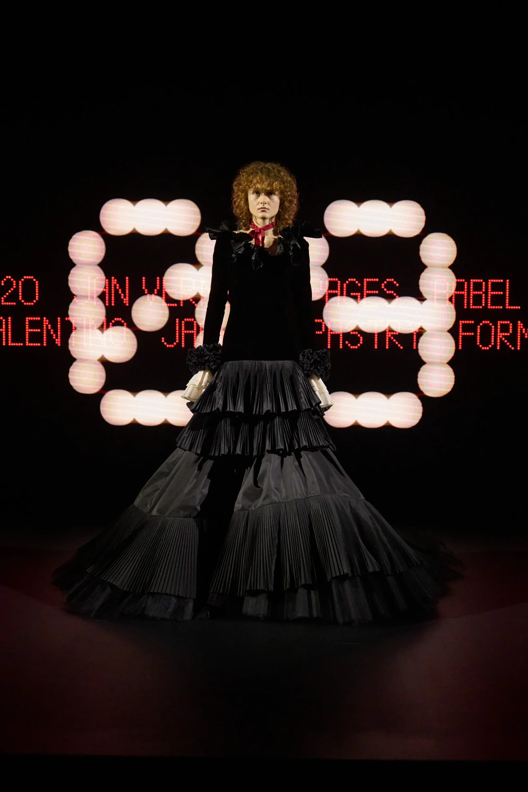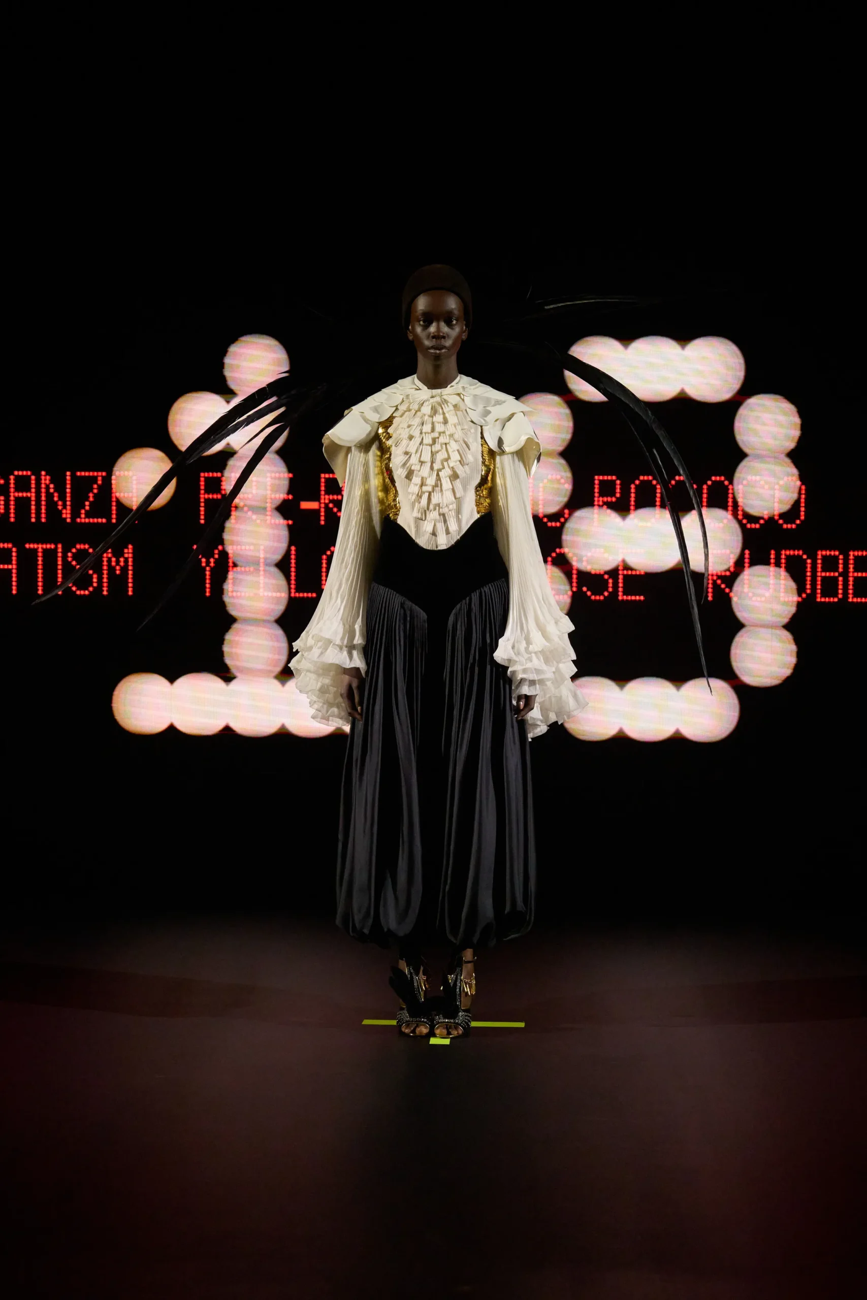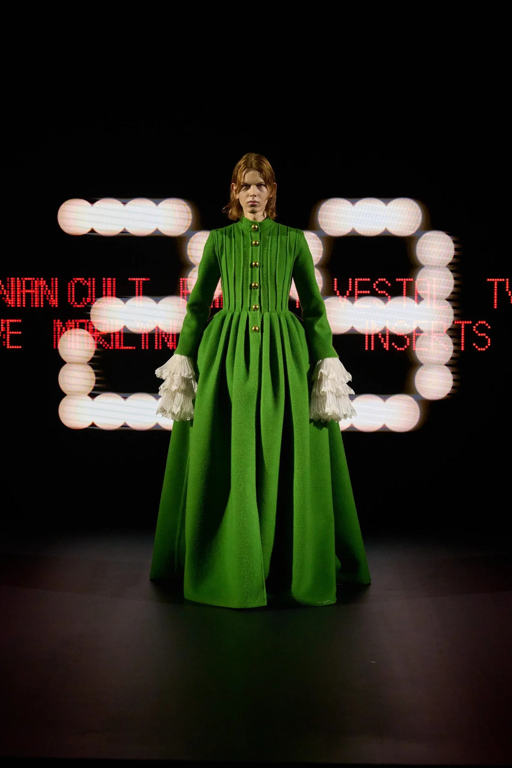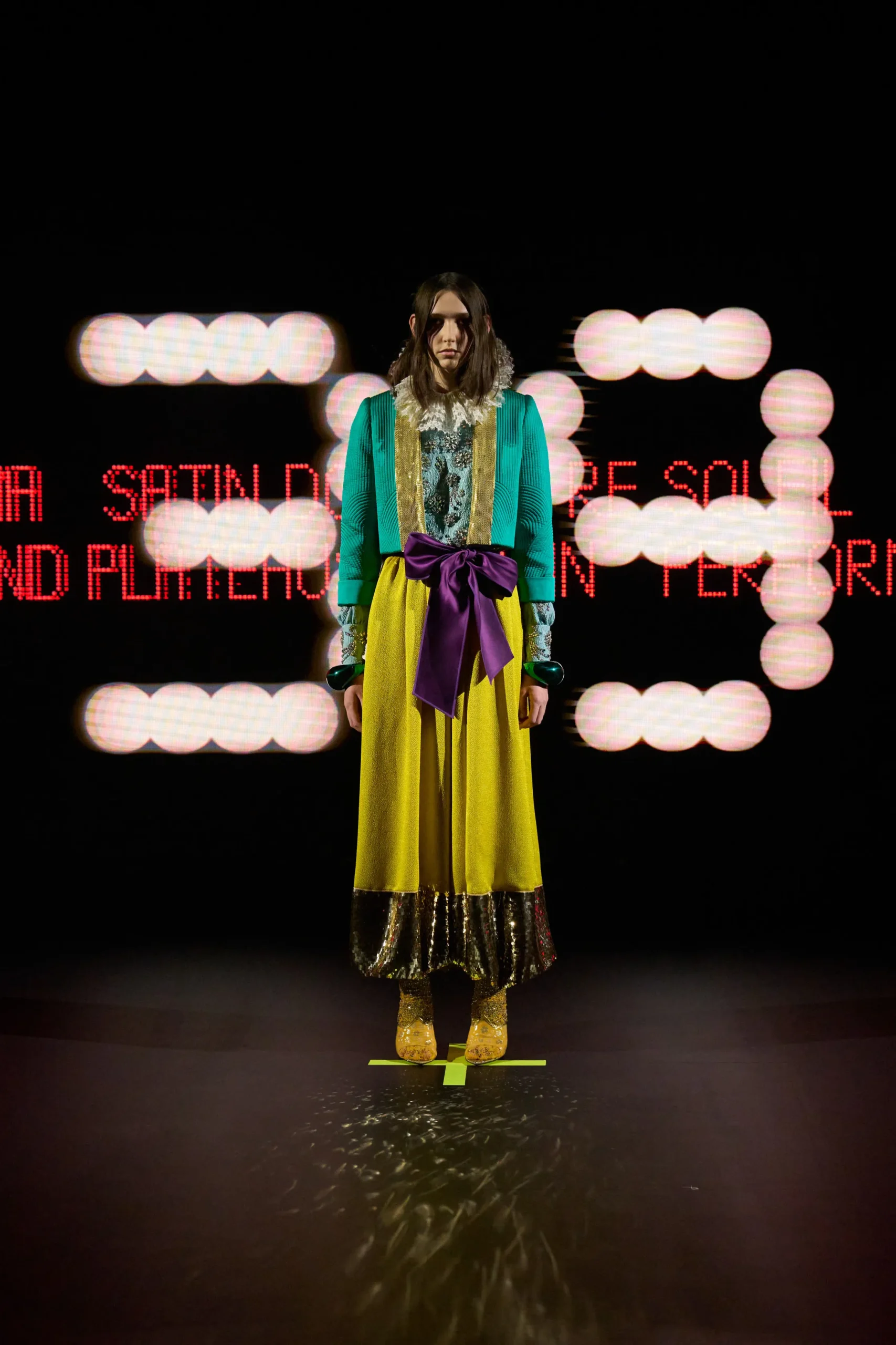 Aquel épico libertinaje suntuoso continúa con la animosa capa de papel mache, sus chaquetas de flautista y guitarrista, en sus ‘lechuguilla’ de acordeón sacados de una pintura de Diego Velázquez — estas ‘Meninas’ que histéricamente son bonitas y demenciales constelaciones, por usar un surrealismo volátil cinematográfico y botánico, que vive en la extraordinaria mente de Alessandro. El Doctor Who de la moda.