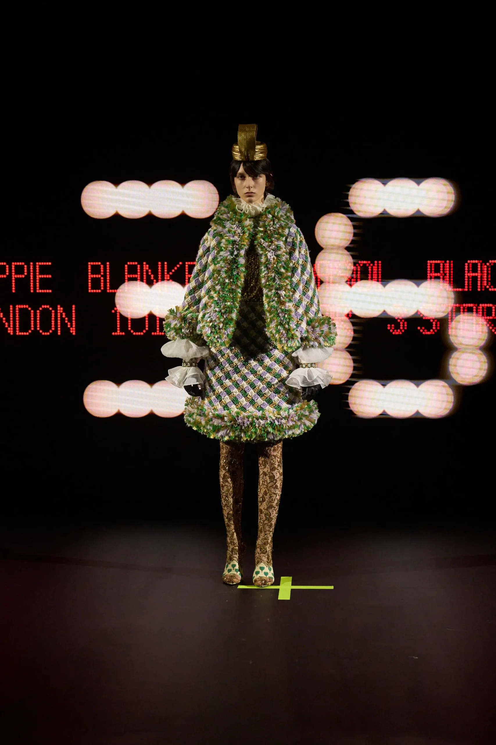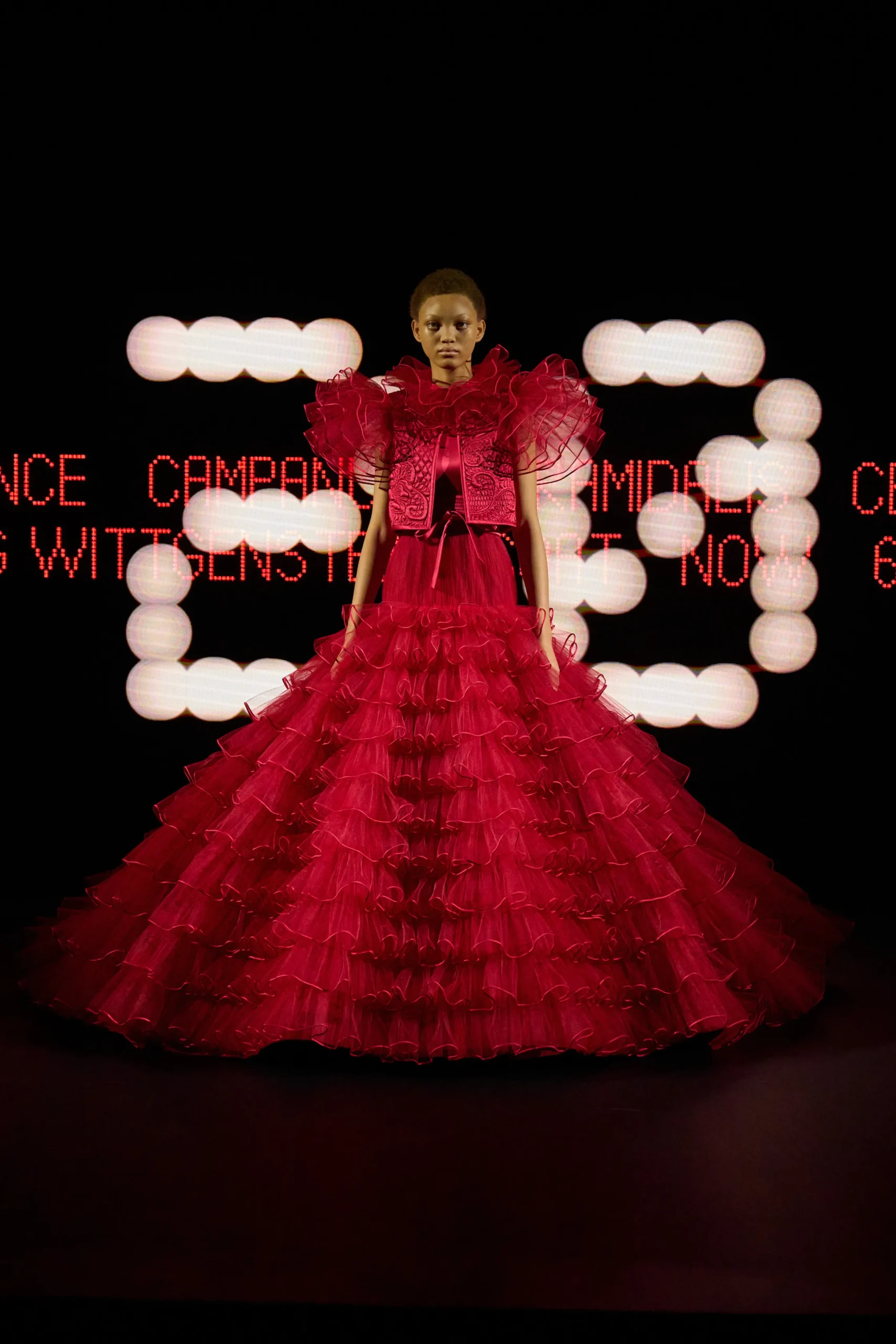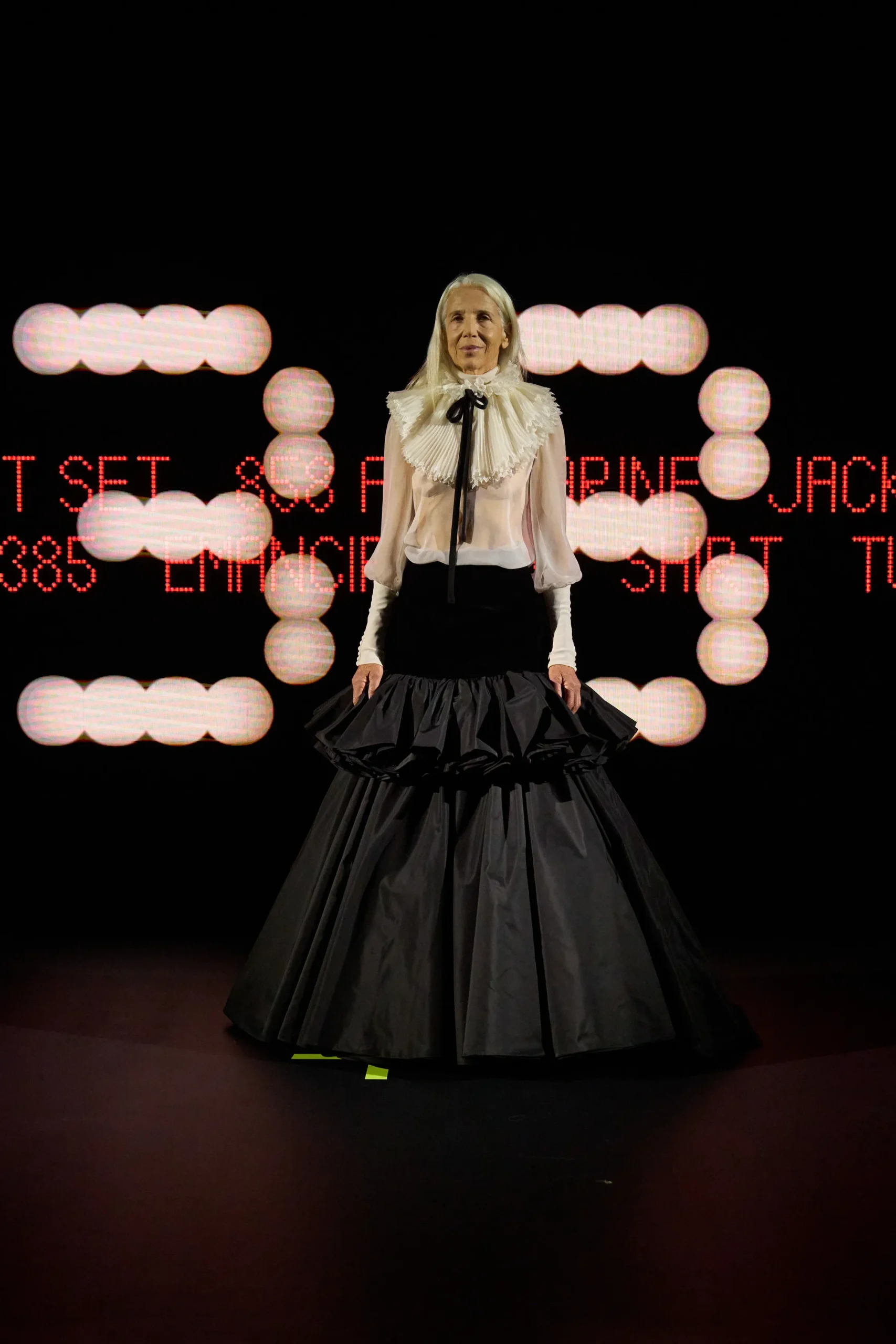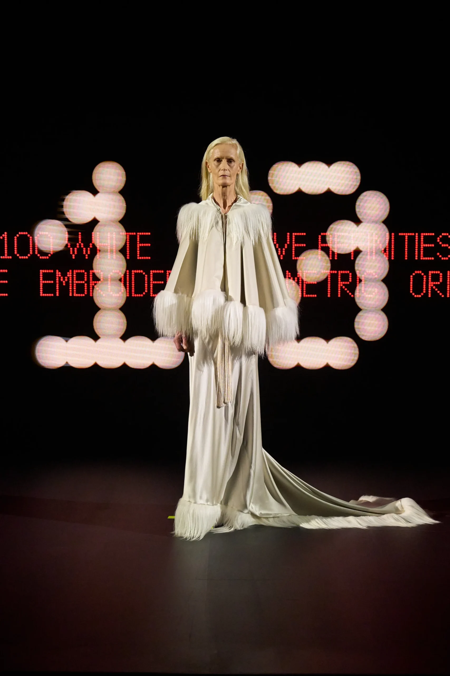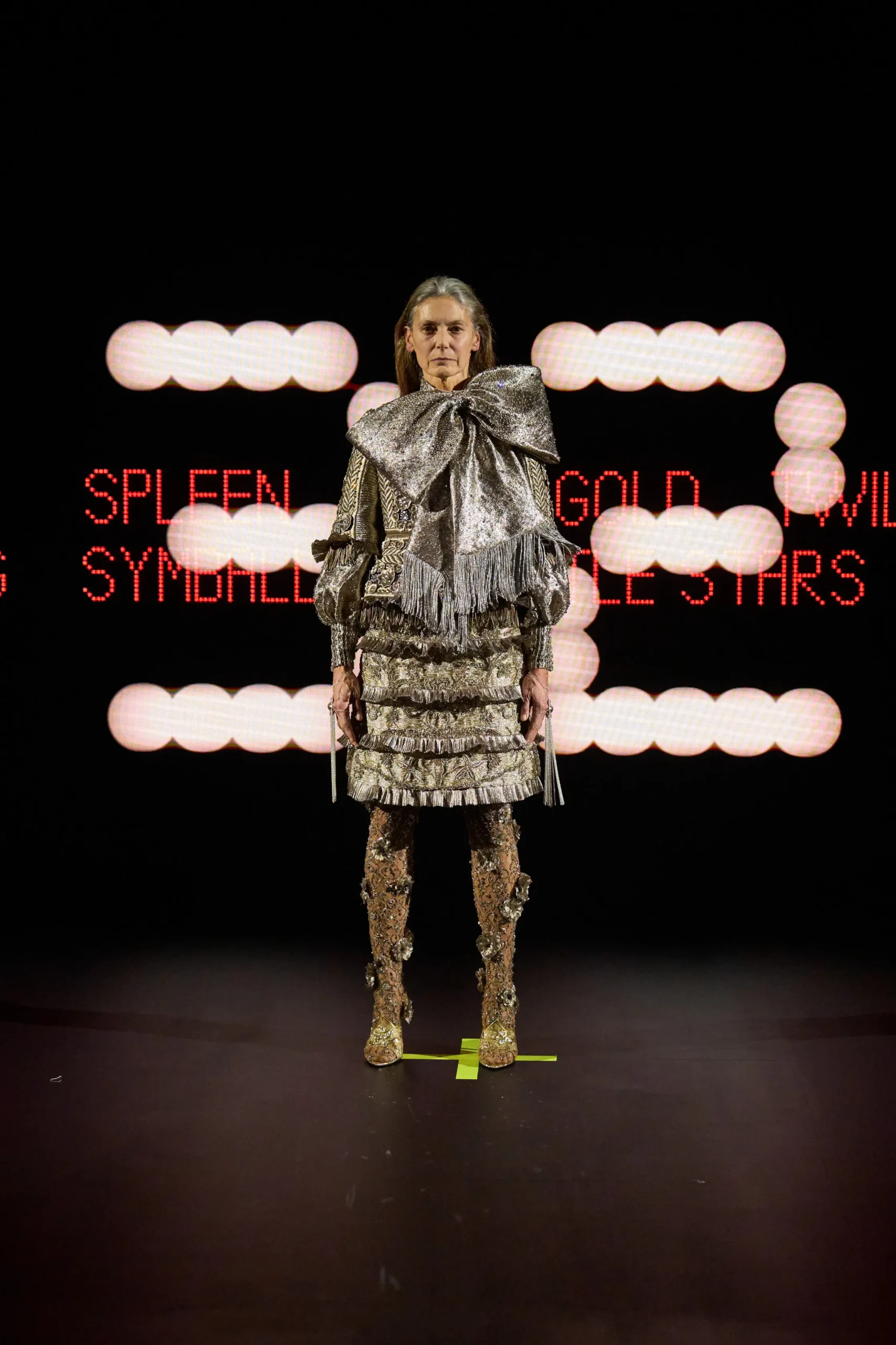 Aquel épico libertinaje suntuoso continúa con la animosa capa de papel mache, sus chaquetas de flautista y guitarrista, en sus ‘lechuguilla’ de acordeón sacados de una pintura de Diego Velázquez — estas ‘Meninas’ que histéricamente son bonitas y demenciales constelaciones, por usar un surrealismo volátil cinematográfico y botánico, que vive en la extraordinaria mente de Alessandro. El Doctor Who de la moda.