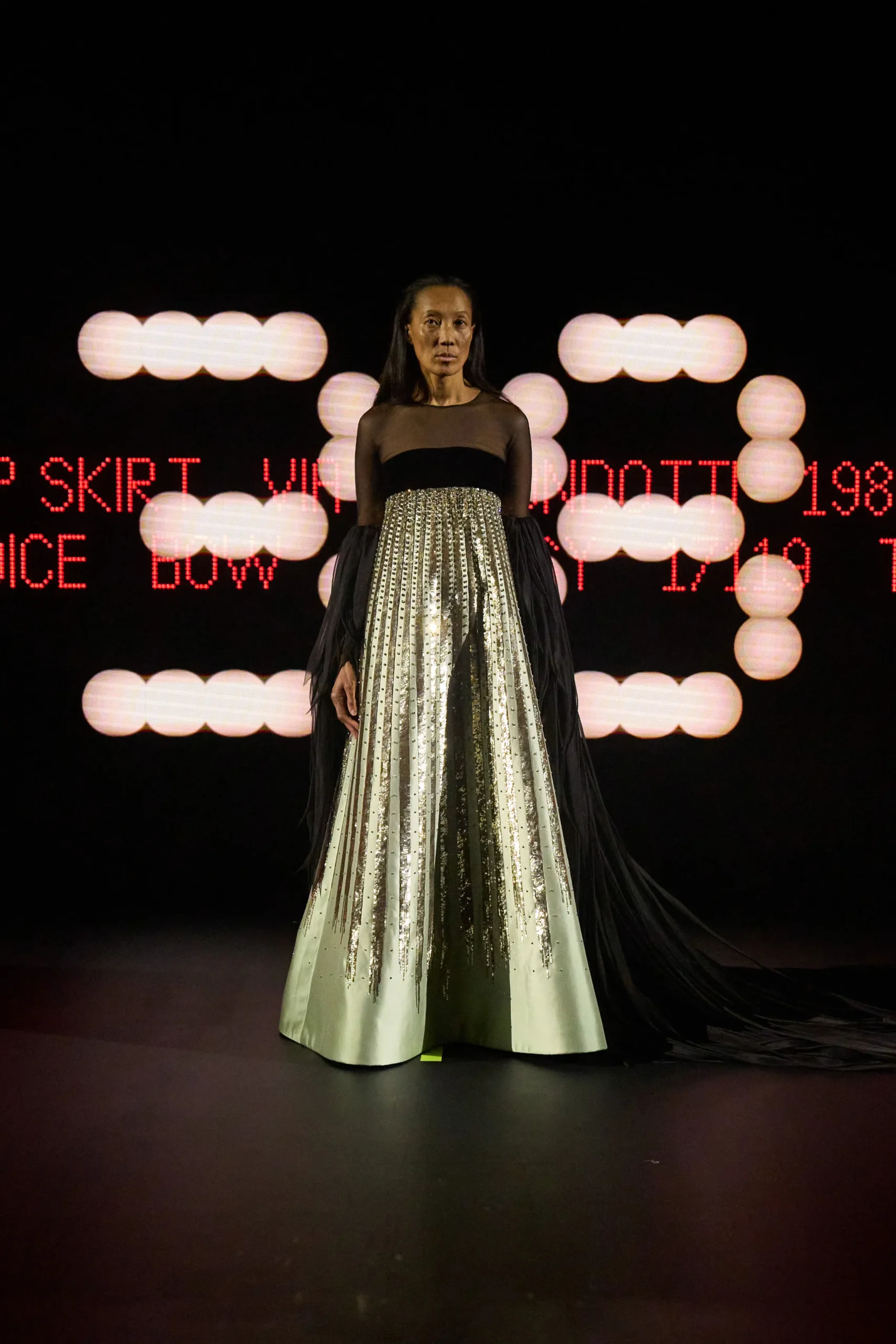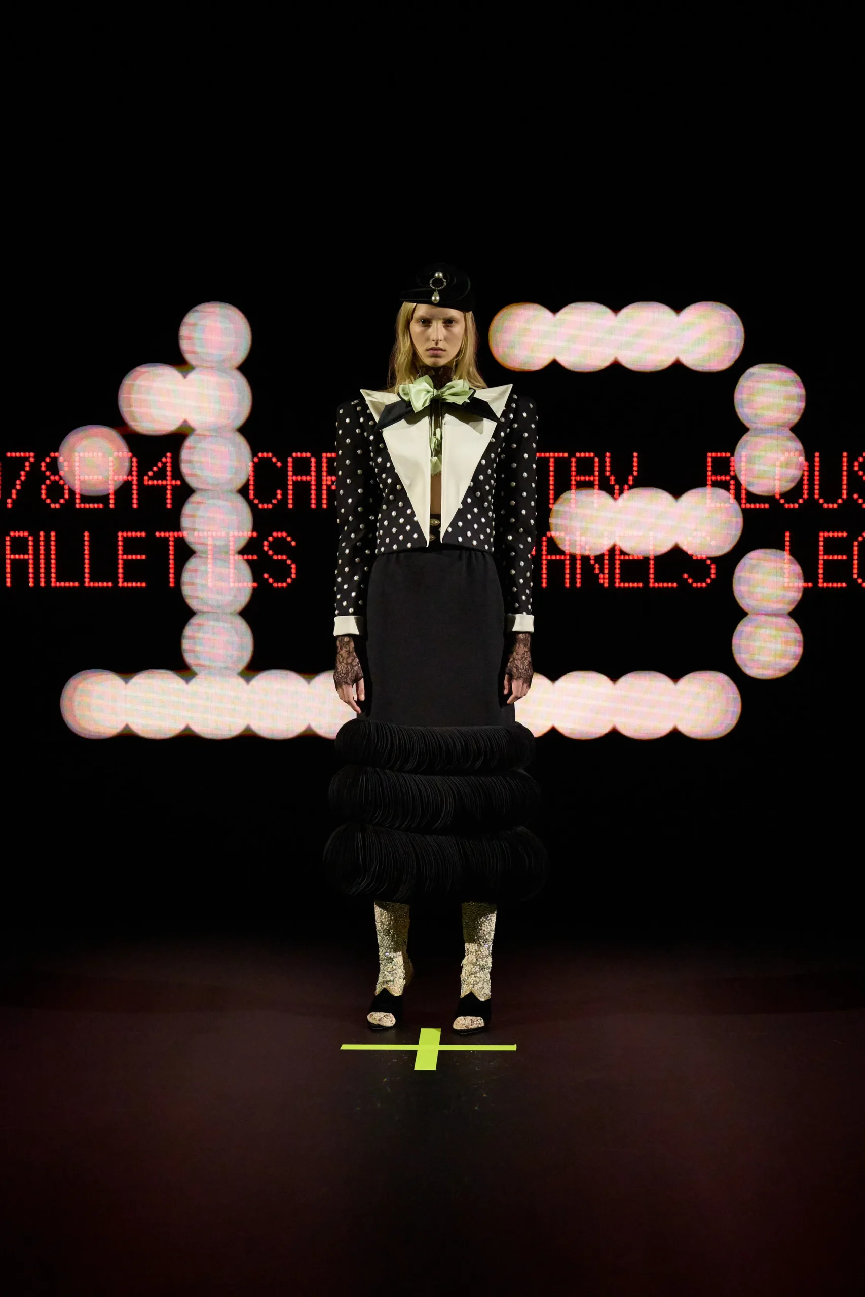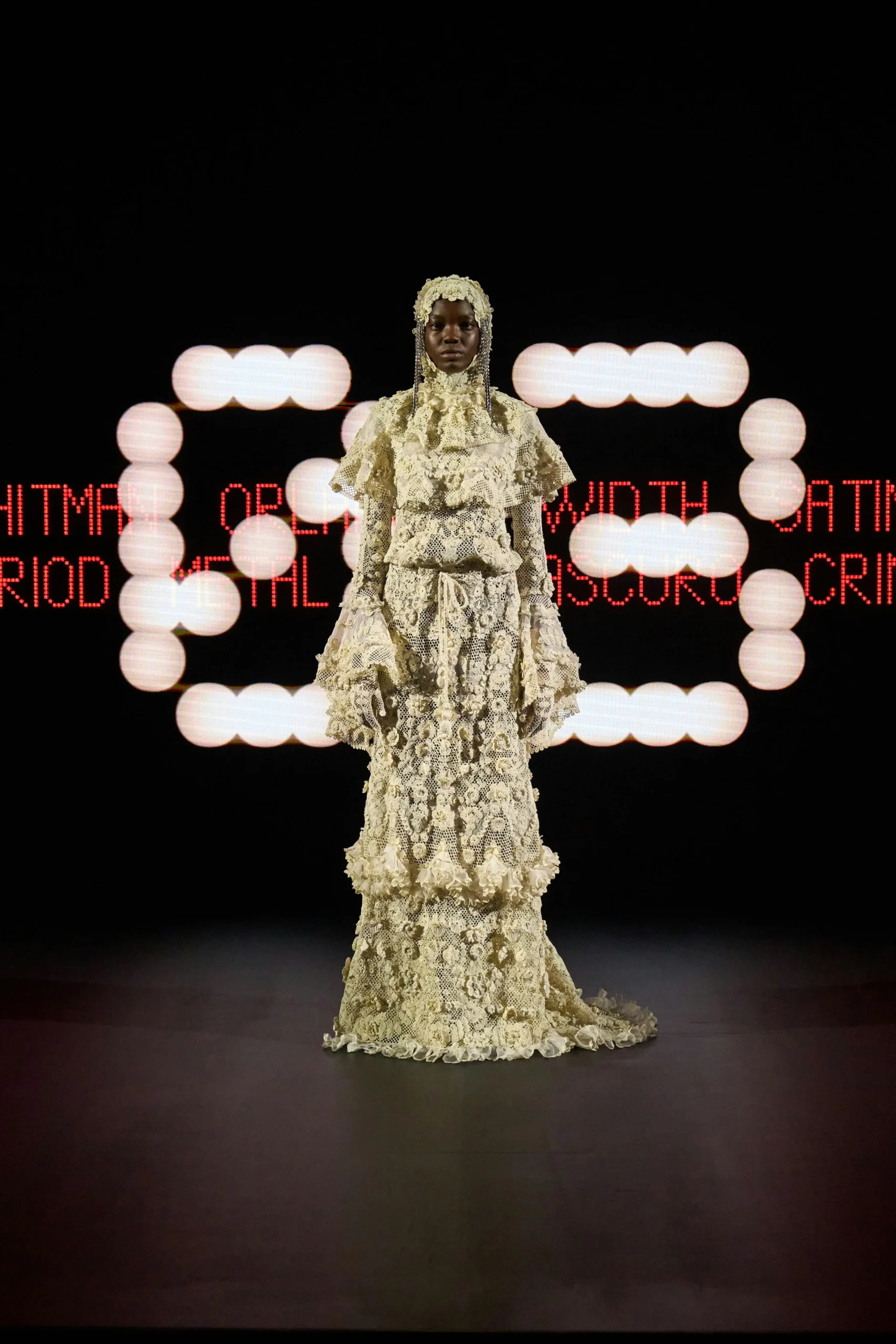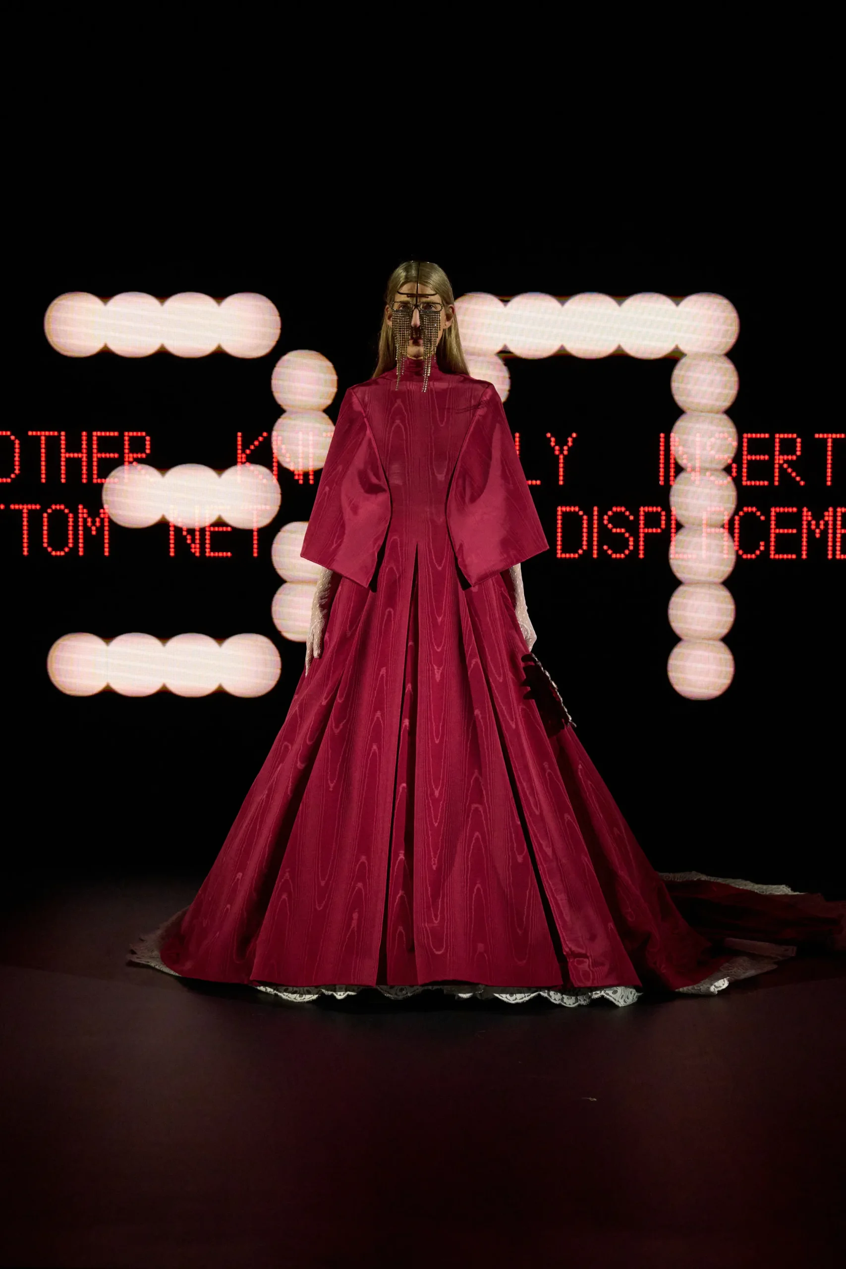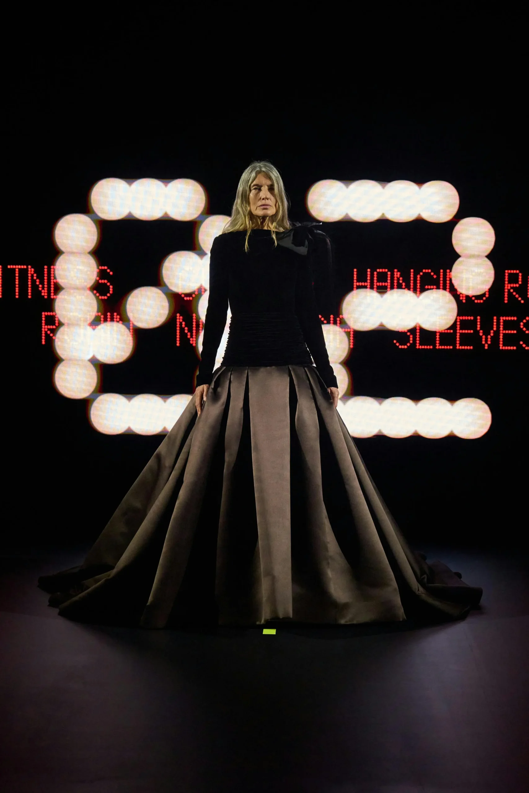 Literalmente, quedé atontado y mareado, cuando las modelos empezaron a correr y jadear desesperadamente contra luces estroboscópicas y una oscuridad que les impedía proseguir hacia el infinito (el otro lado del escenario) con sus descomunales lívidas crinolinas de estilo Tudor y enmarañados cabellos de Isabel I, que confusamente, las protegían de tropezar a toda costa de sus plumosos sombreros de cazador. El debut de Alessandro Michele en la línea de alta costura de Valentino fue exorbitante y provocativo, arrastrado por una imaginación febril alborotadora que ha transformado intrincadas piezas fabulosamente epilépticas.