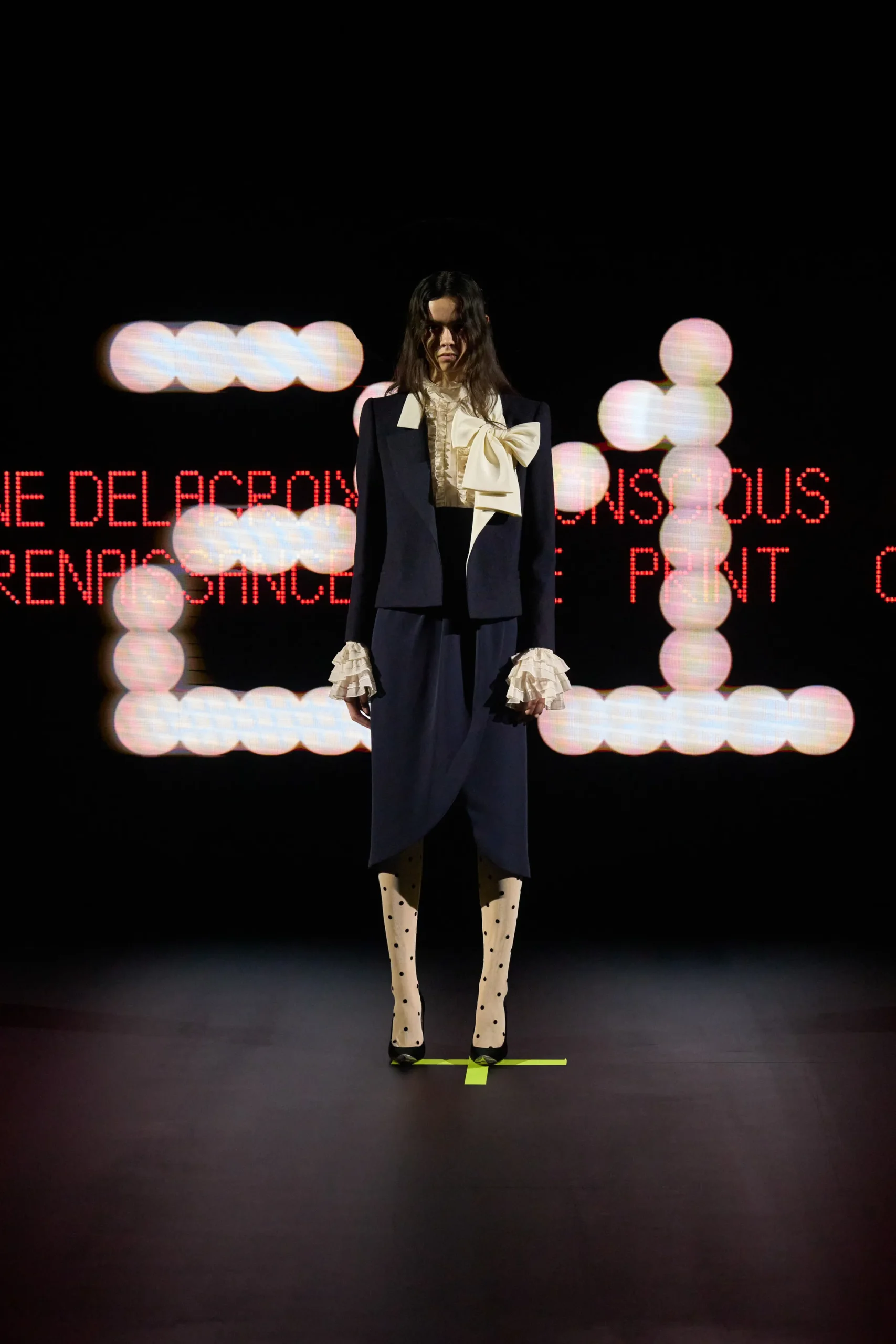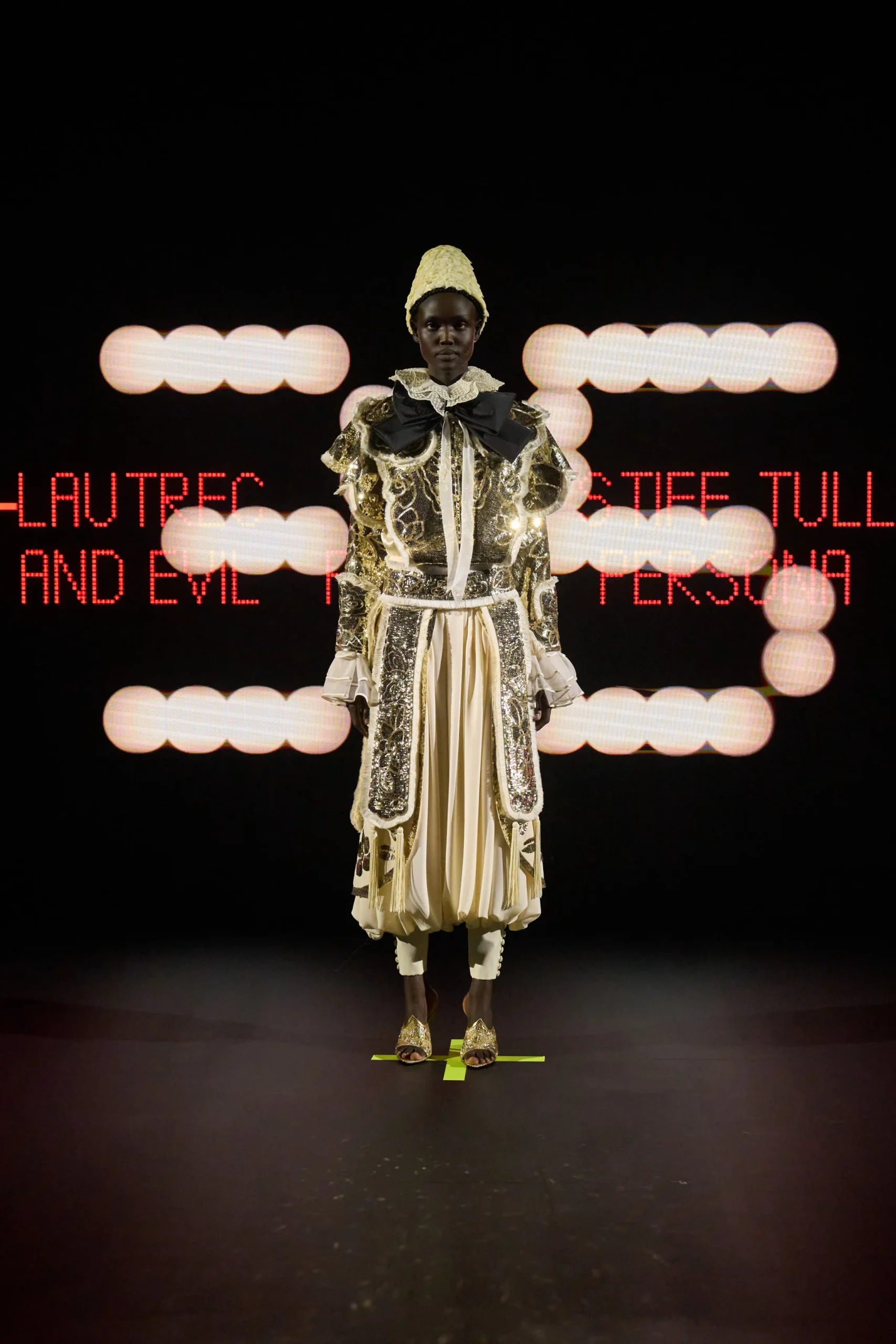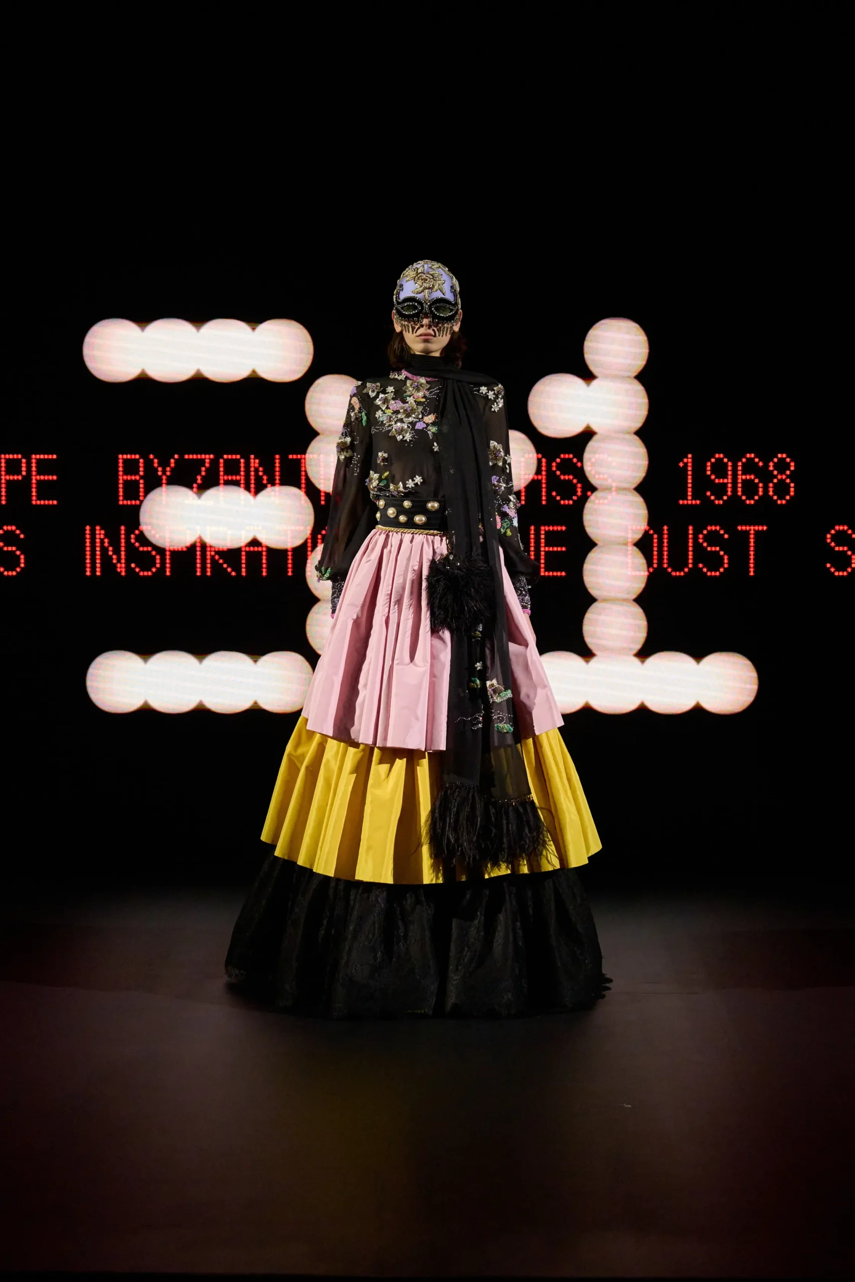 Su psicótico torbellino lleno de obsesiones infantiles e investigaciones, es una extremada fantasía por la bendita historia, centrarse de referencias literarias y artísticas que transportaban por un carnaval de Venecia, un baile en la corte de Enrique VII, en la mismísima boda de Marie Antoinette en Versalles o en una fiesta burguesa victoriana, con una extremista e insólita belleza folclórica que realzaba su amorío con los excesos aristocráticas y poéticos de la Europa medieval, renacentista, barroca, industrial e incluso, el viejo Hollywood. Era una ventana que lanzaba a una profunda visión literaria que te seducía por aura en forma de una incontenible masquerade que bautizó como “Vertgineaux”. Cada look que atravesaba el electrónico fondo teatral en el que corrían letras rojas digitales proyectadas, describen la inspiradora meticulosidad fulgurosa que poseían.